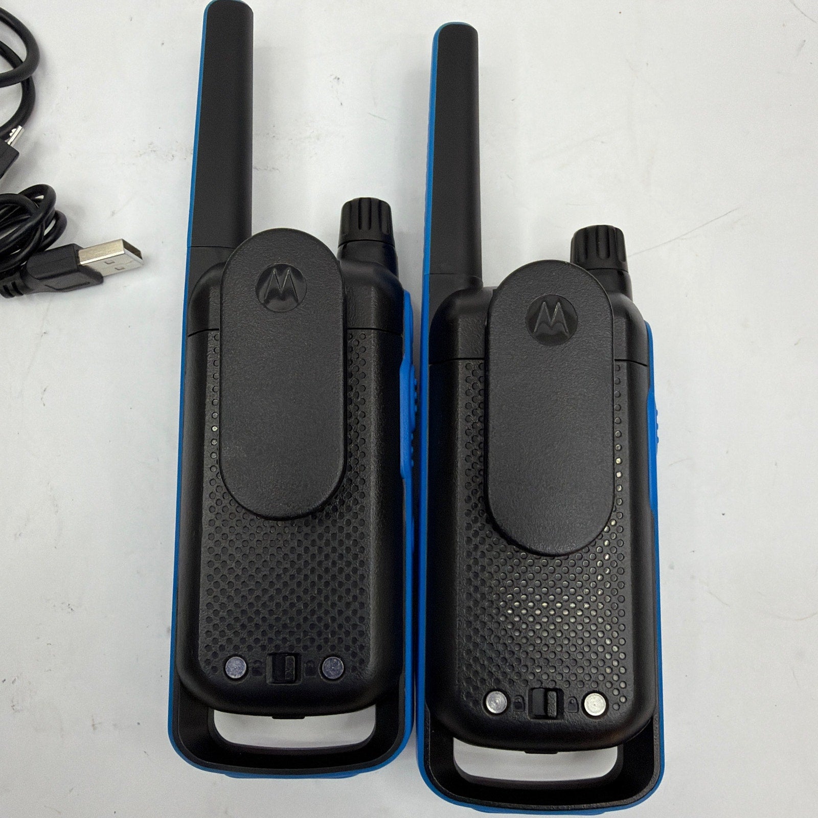 Pre-owned pair of Motorola Talkabout T800 handheld two-way radios with light cosmetic wear from normal use. Includes both radios, two battery packs, two USB charging cables, and two USB wall adapters (only what is shown). Tested working. Ba