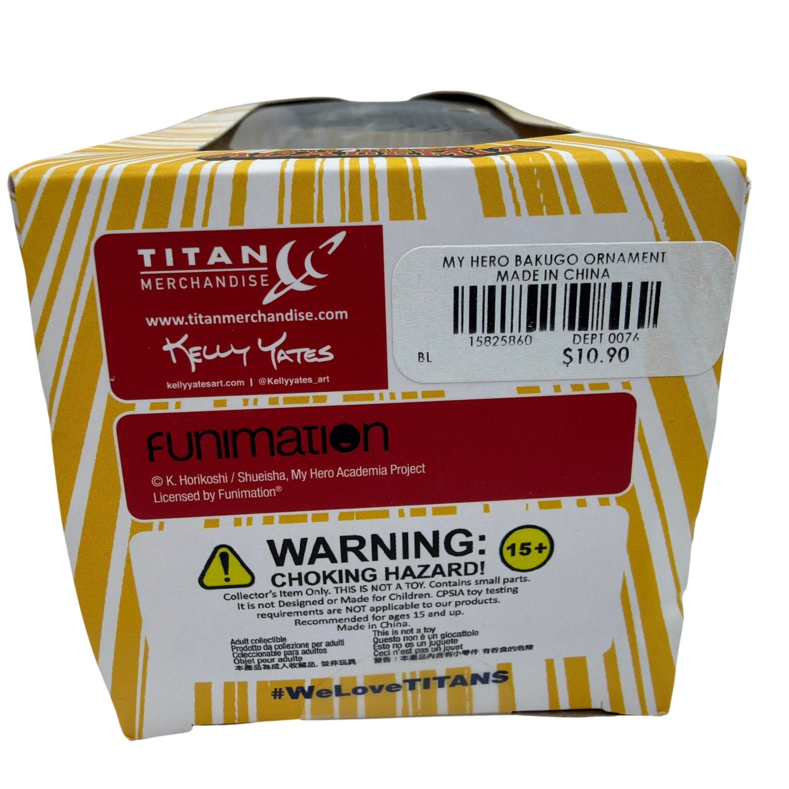 My Hero Academia Kawaii Titans holiday ornament featuring Katsuki Bakugo, approximately 3 inches tall, still sealed inside the original window box. The ornament itself appears unused, but the outer box has heavy creasing, crushing, and a torn corner as shown. Packaging shows additional general wear and may have scuffs on the clear window. Sold as shown with original retail box.