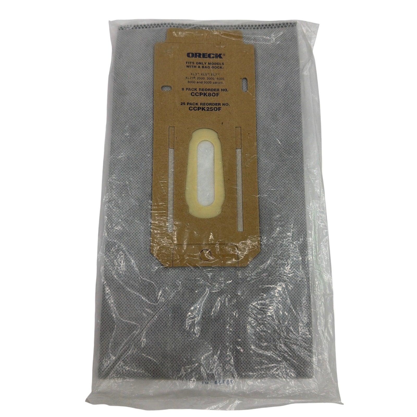 Set of four genuine Oreck disposable Type CC filter system vacuum bags, each sealed in original plastic. Compatible with Oreck uprights that use a Bag Dock (many XL/XL2/XL21 and 2000–8000 series; please verify fit). Bag markings include CCPK80F and CCPK25OF. New and unused; outer packaging may show minor wrinkles; guaranteed to be fully functional.