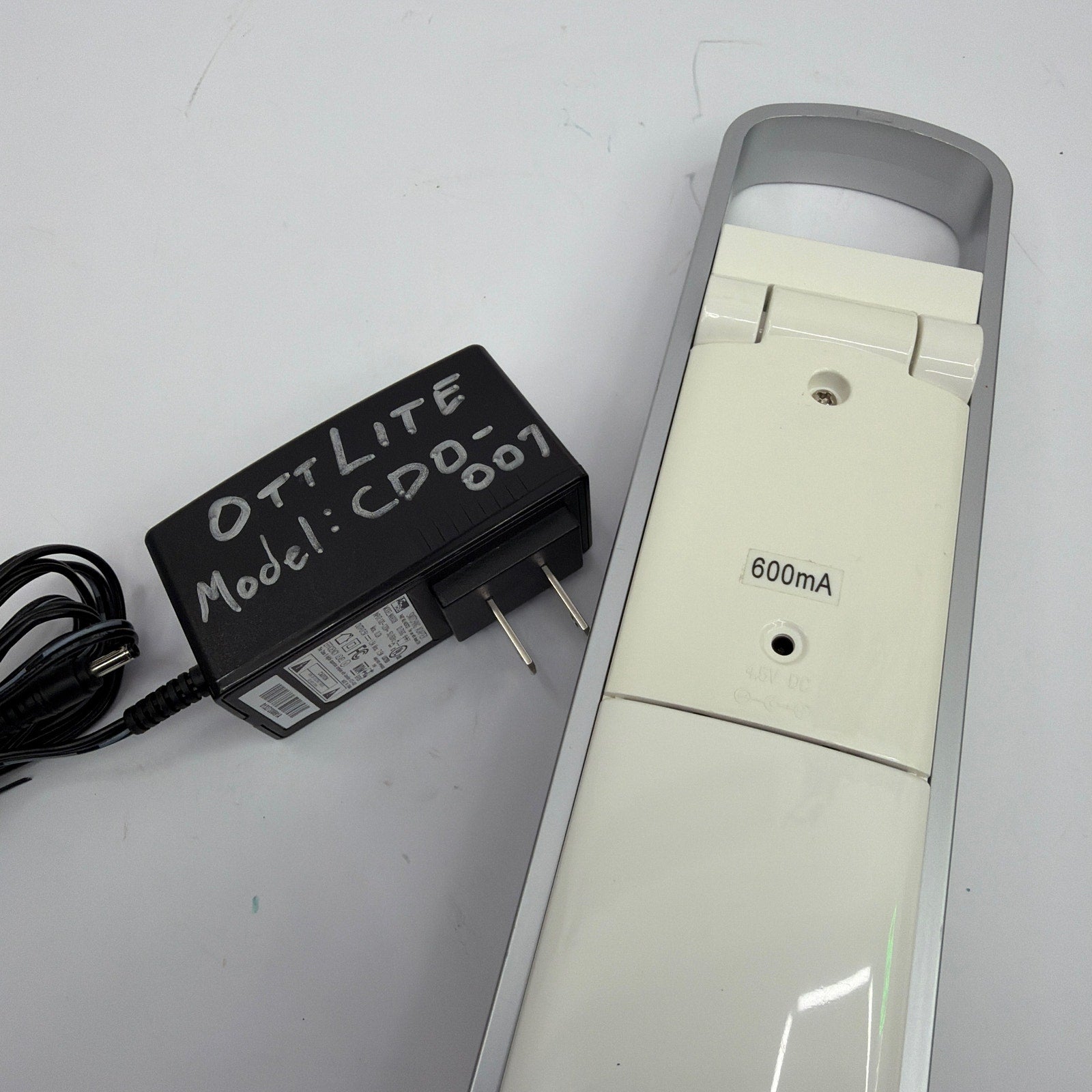 OttLite LED mobile task/desk lamp in white and gray. Tested working. Includes the AC power adapter shown; no batteries are included. Requires 3 AAA batteries for cordless use and may show minor cosmetic wear from normal use.