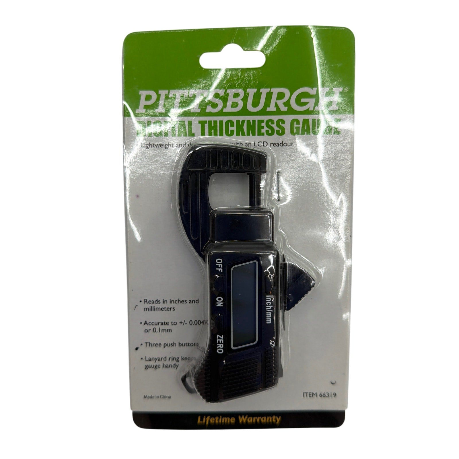Pittsburgh digital thickness gauge (Item 66319) in original sealed retail packaging. Package includes an SR-44 button cell battery. Packaging may show minor shelf wear from storage.