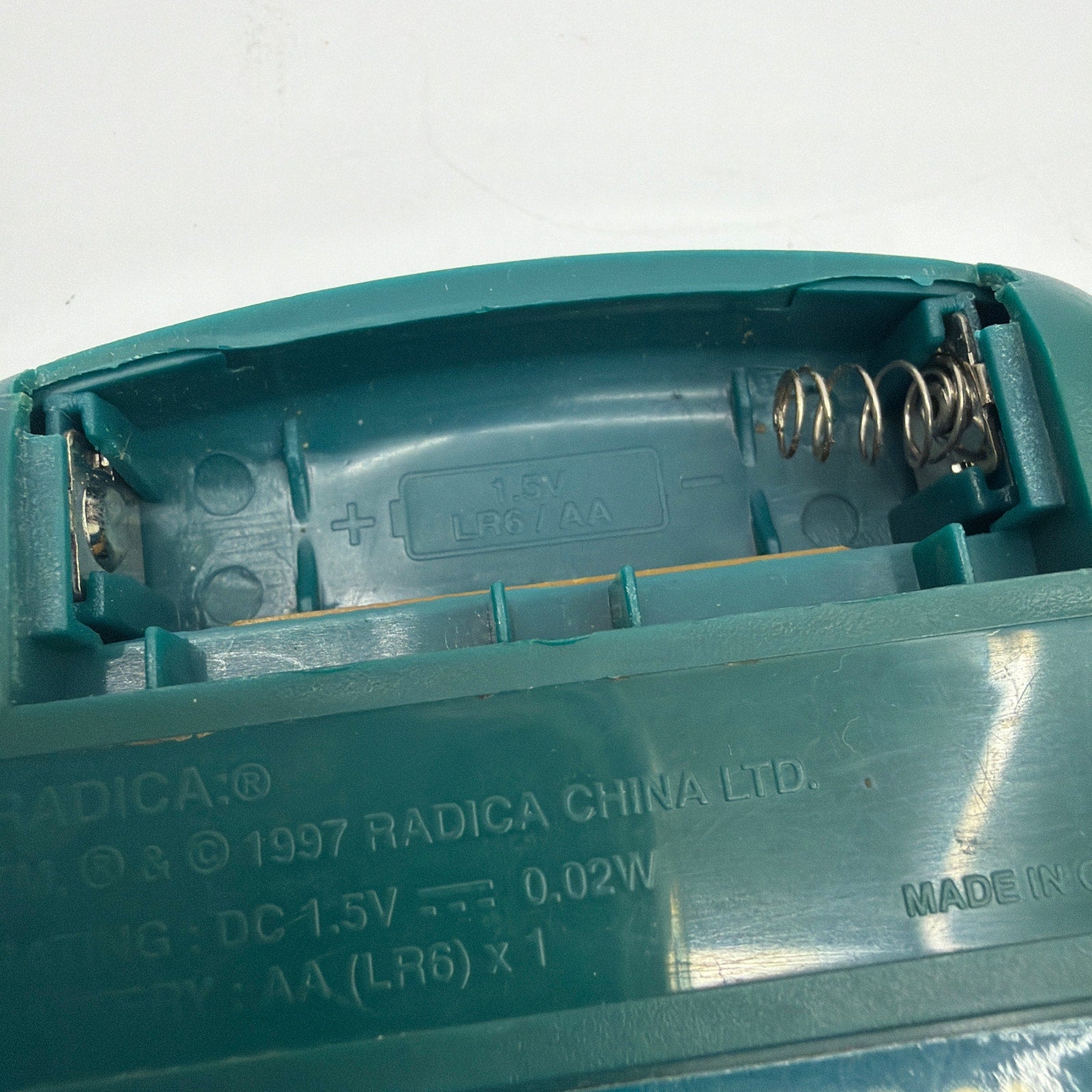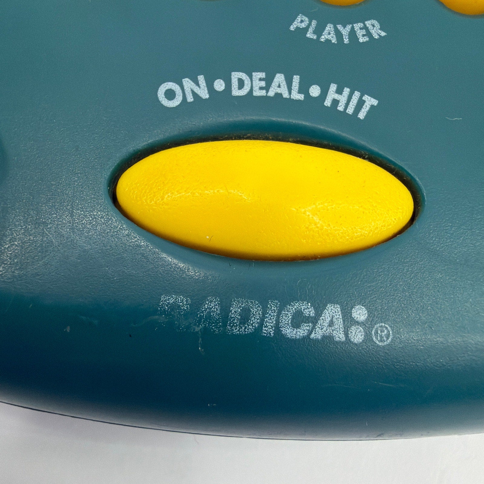 Radica Pocket Blackjack 21 handheld electronic game (copyright 1997). Tested working. Pre-owned with noticeable cosmetic wear including scuffs/scratches and a partially peeled/torn rear label. Requires 1 AA battery (not included).
