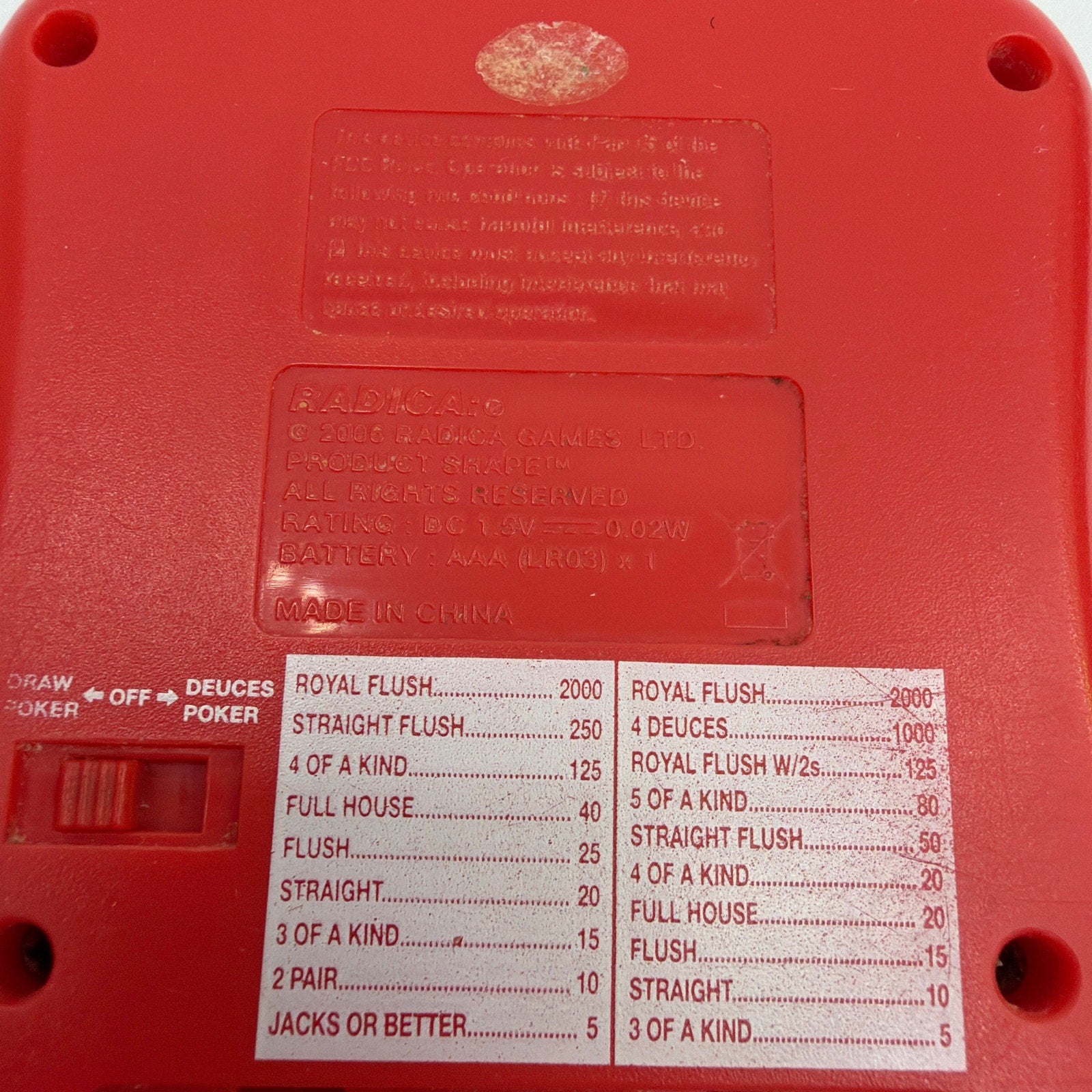 Radica Pocket Poker (Draw & Deuces) handheld electronic game in red, copyright 2006. Tested working. Cosmetic wear from use is present, including scuffs/scratches and some label wear/residue on the back. Includes the game unit only; requires 1 AAA battery (not included).