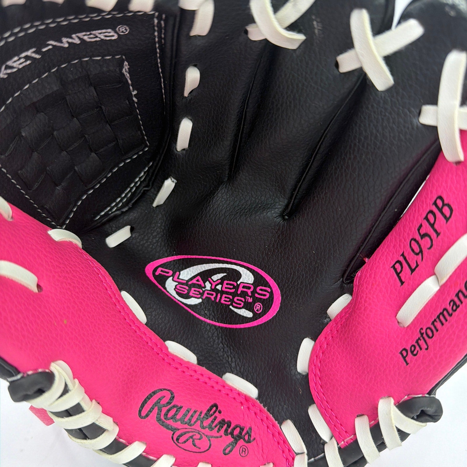 Rawlings Players Series glove in pink and black (model PL95PB; marking ESBH5). Condition appears excellent with little to no visible wear; light scuffs may be present from handling/storage. Listing is for the glove only; no other accessories are included.