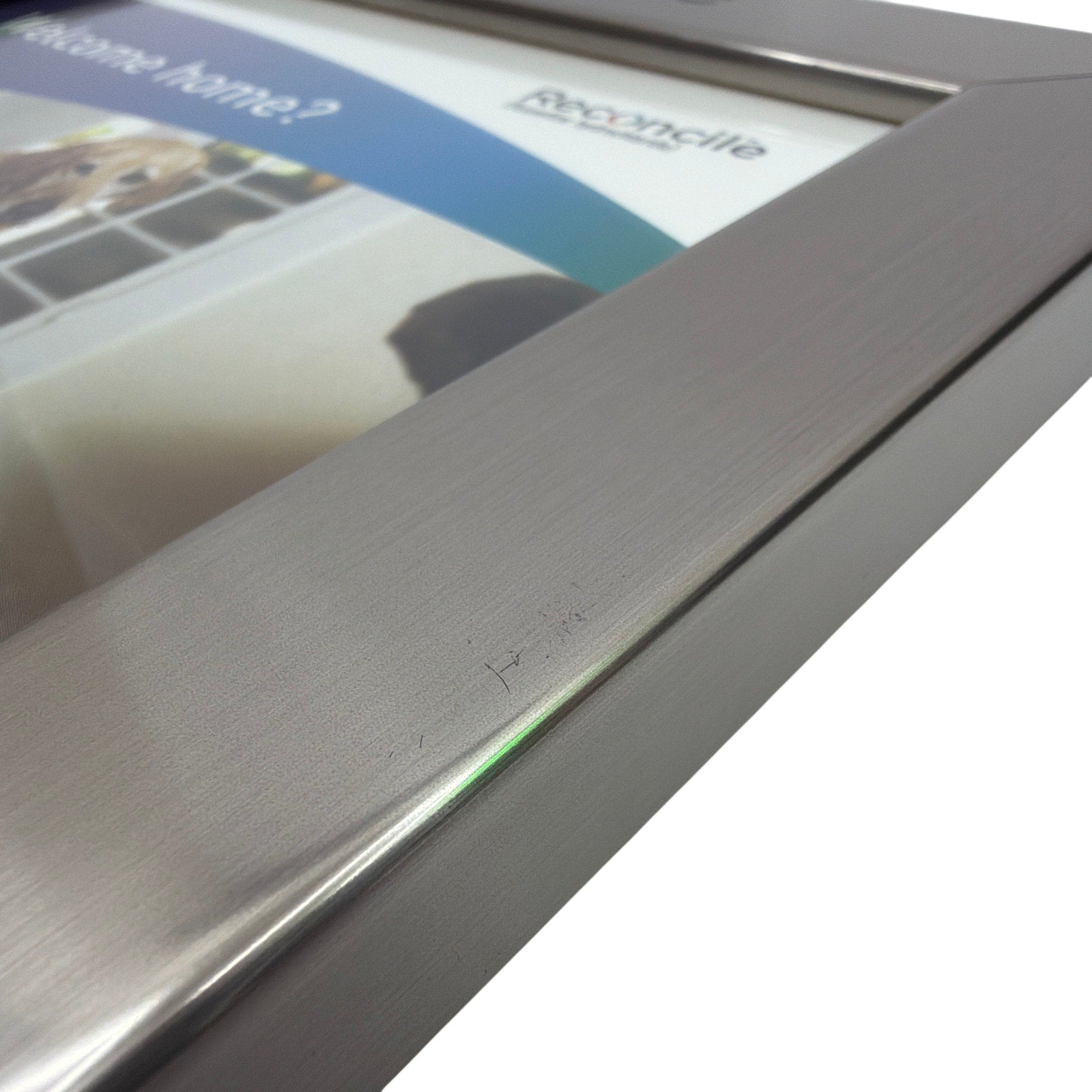 Pre-owned metal-framed veterinary office wall display for Reconcile (fluoxetine hydrochloride) featuring a dog and “Welcome home?” headline. Includes the original printed advertisement and brushed silver-tone frame with glass or clear plastic front, as shown. Frame shows light to moderate surface scratches and scuffs in several areas but remains structurally sound with no cracks observed. Poster insert appears clean with no major creases or stains visible. Sold as pictured with frame and insert together.