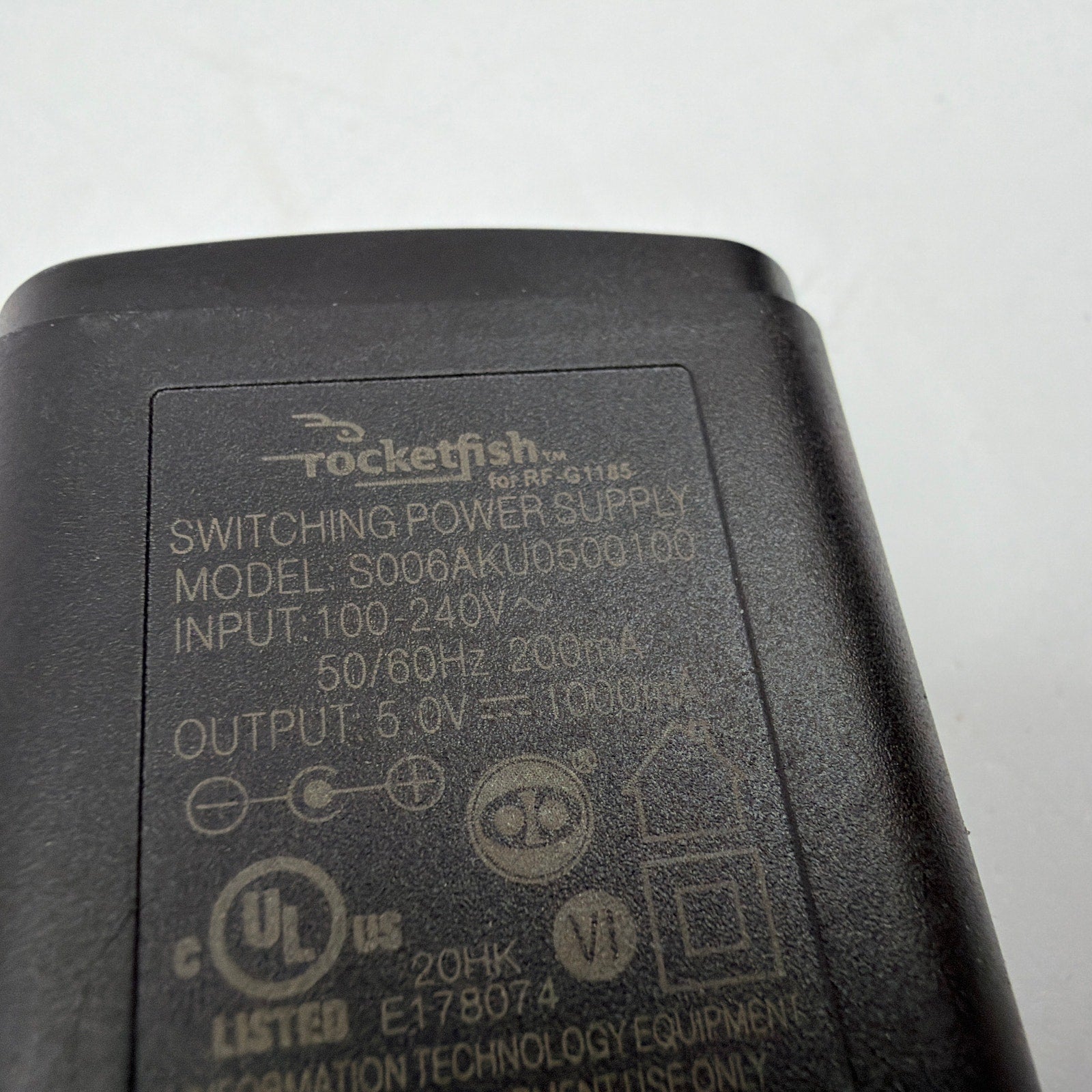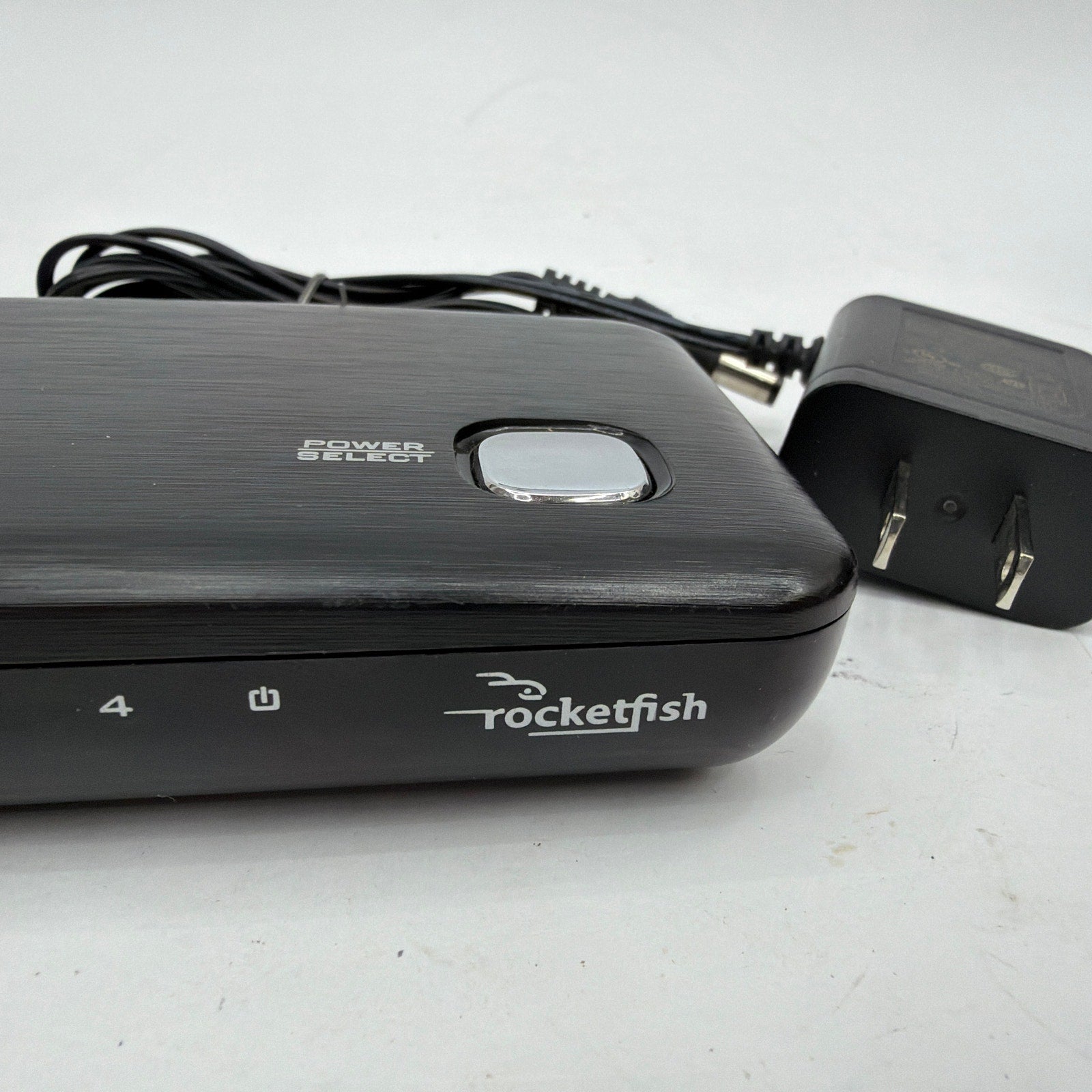 Rocketfish HDMI switch with 4 HDMI inputs and 1 HDMI output, with manual push-button input selection. Pre-owned with visible surface wear/scuffs and attached Velcro strips/residue on the bottom. Includes the HDMI switch and AC power adapter only (no remote or HDMI cables shown).
