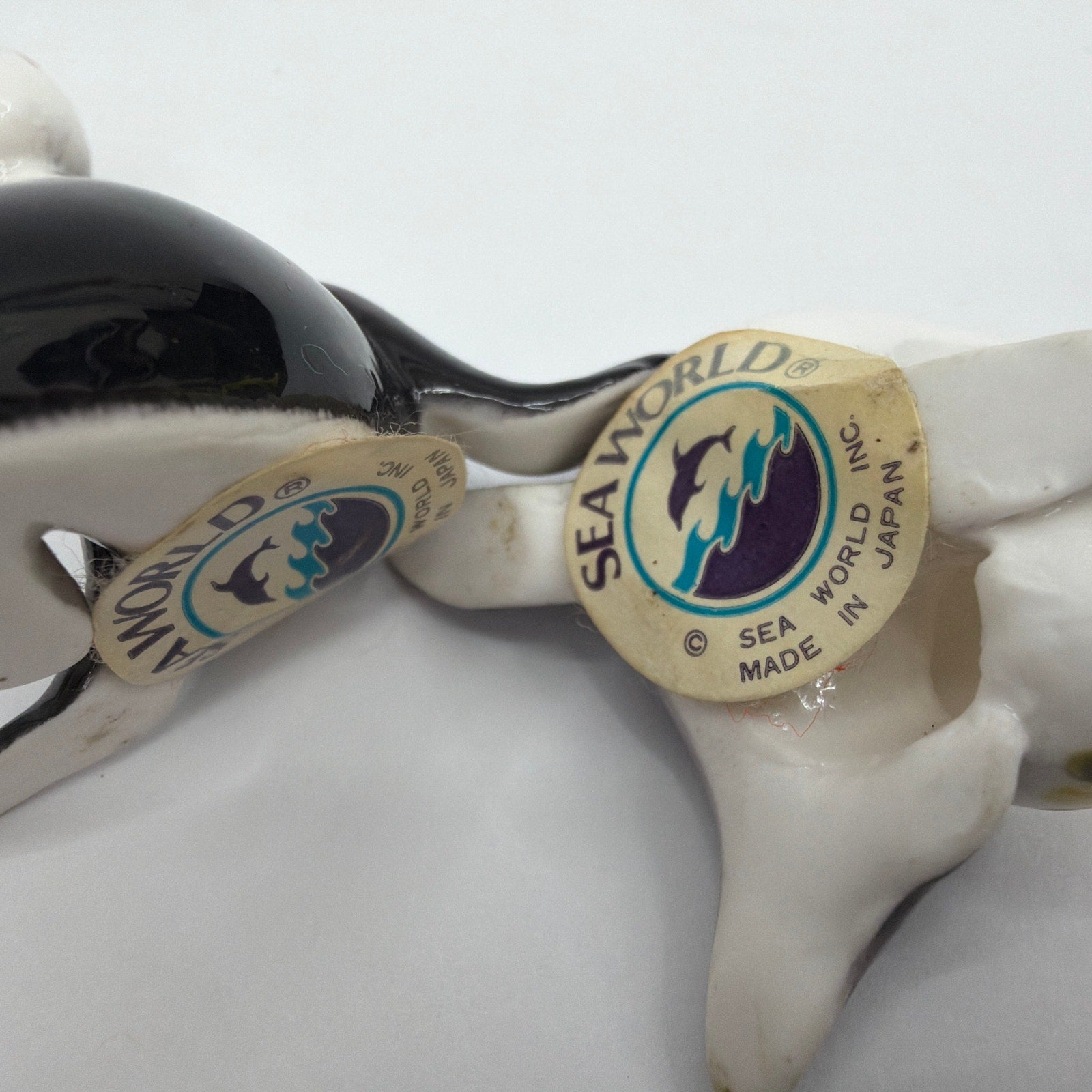 Set of two small SeaWorld sea lion figurines with balancing balls, approximately 2 x 2 x 2 inches each. Marked with SeaWorld labels and “Made in Japan.” Pre-owned with light wear; labels show age and may have discoloration or edge wear. No other accessories included.