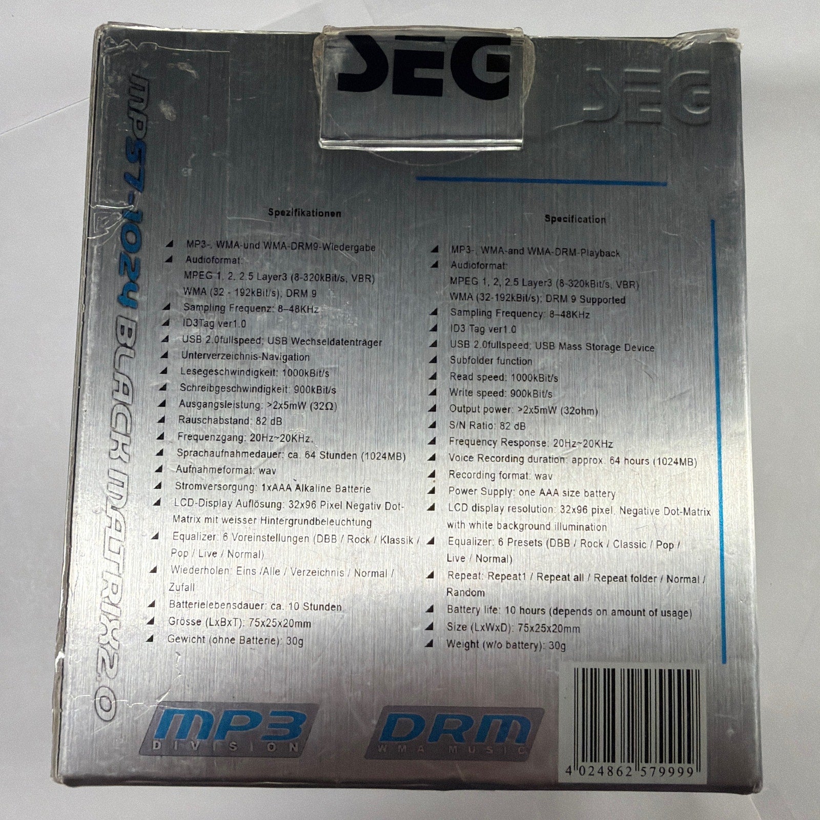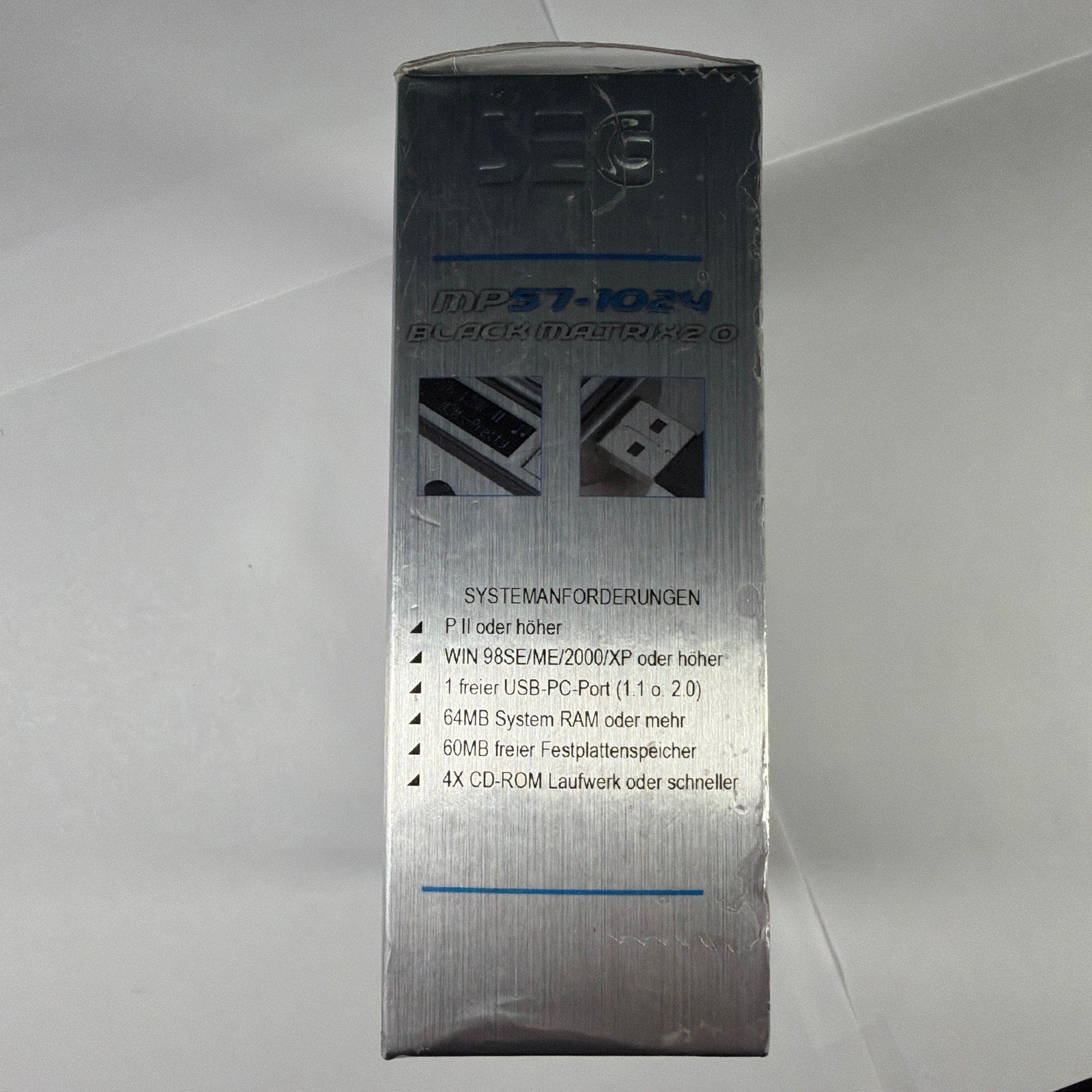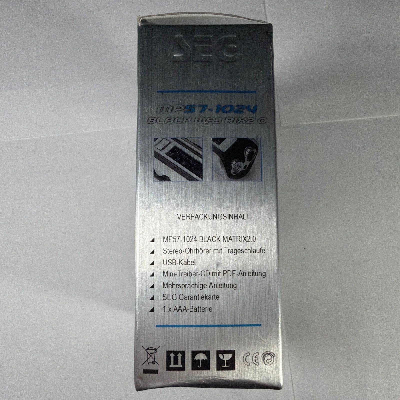 SEG MP57-1024 “Black Matrix 2.0” 1GB USB MP3 player, tested working. Includes the MP3 player and original retail box; any additional accessories are only included if shown in the photos. Box shows noticeable shelf wear, creasing, and scuffing from storage.