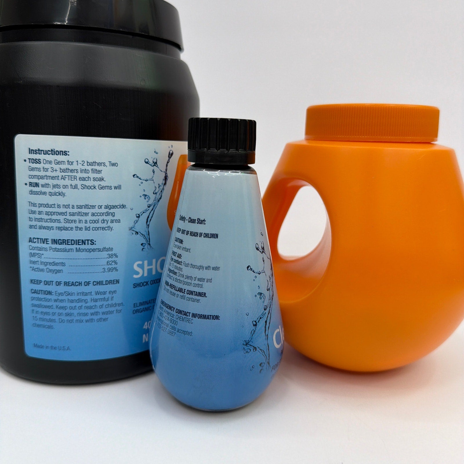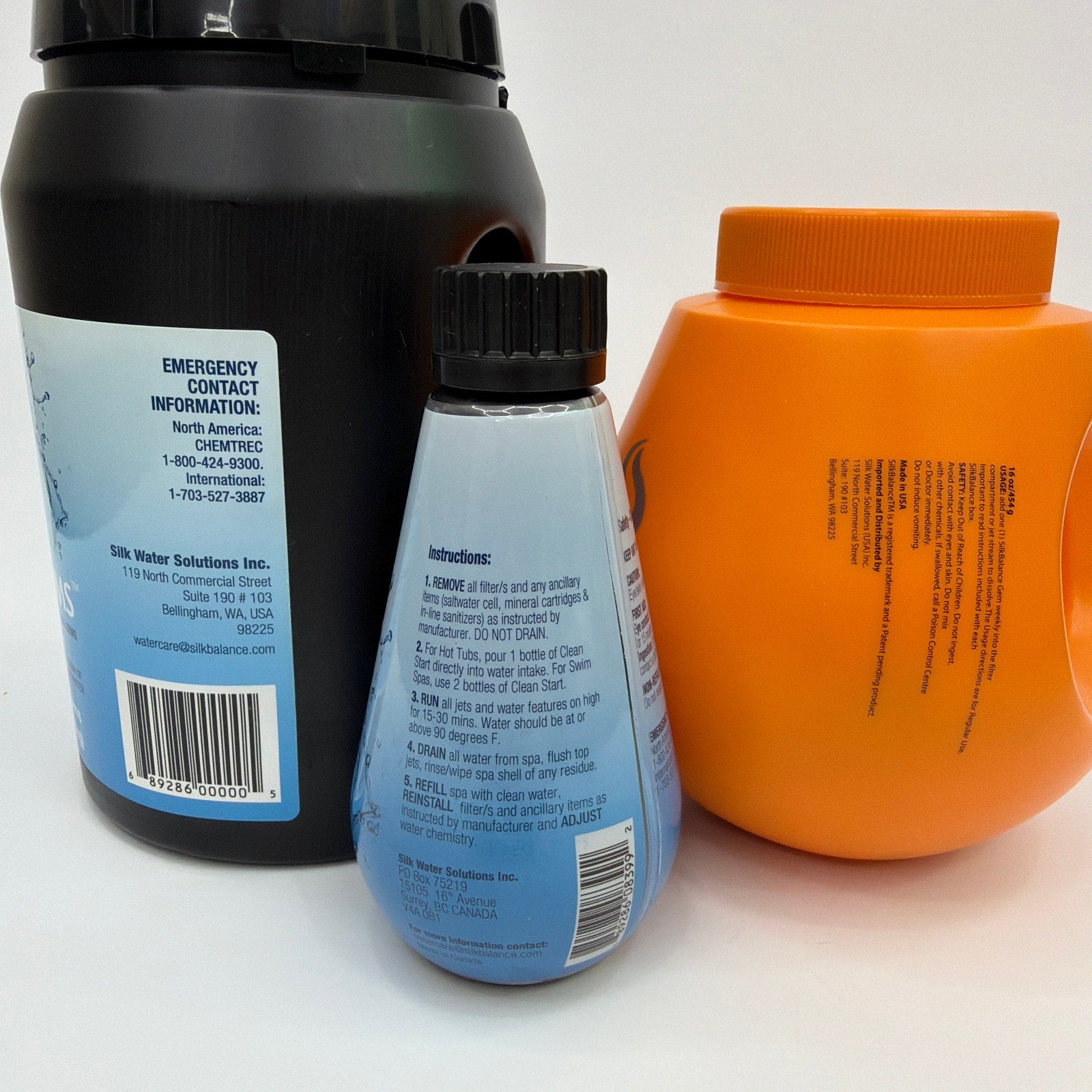 Includes SilkBalance Shock Gems container, SilkBalance GEM spa water care system container, and a SilkBalance Clean Start plumbing line cleaner bottle. Items are opened and may be partially used; remaining quantity is unknown (see photos). Containers show normal handling wear and may have minor scuffs or residue from storage.