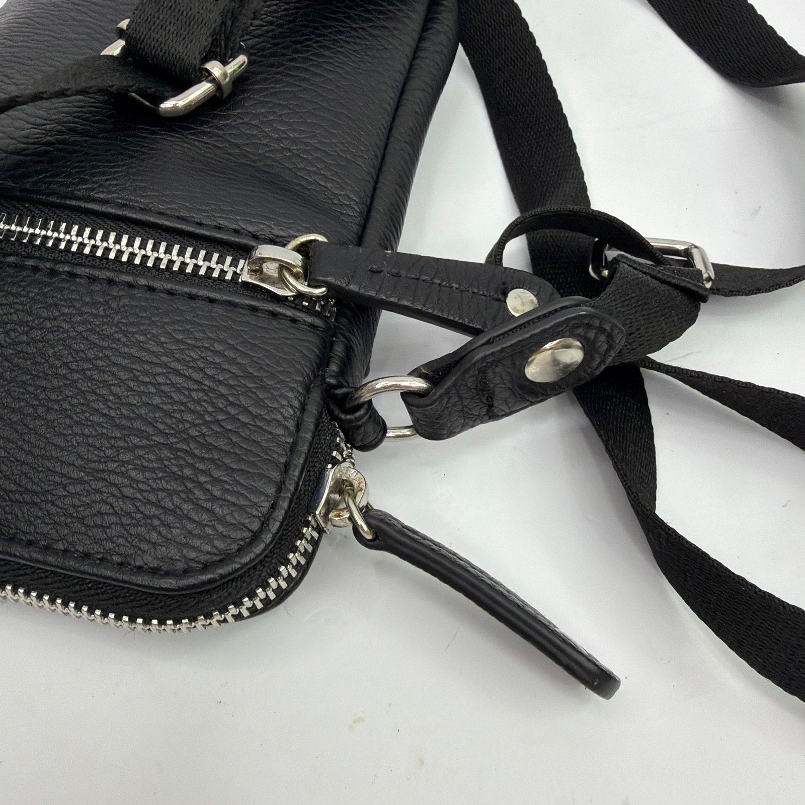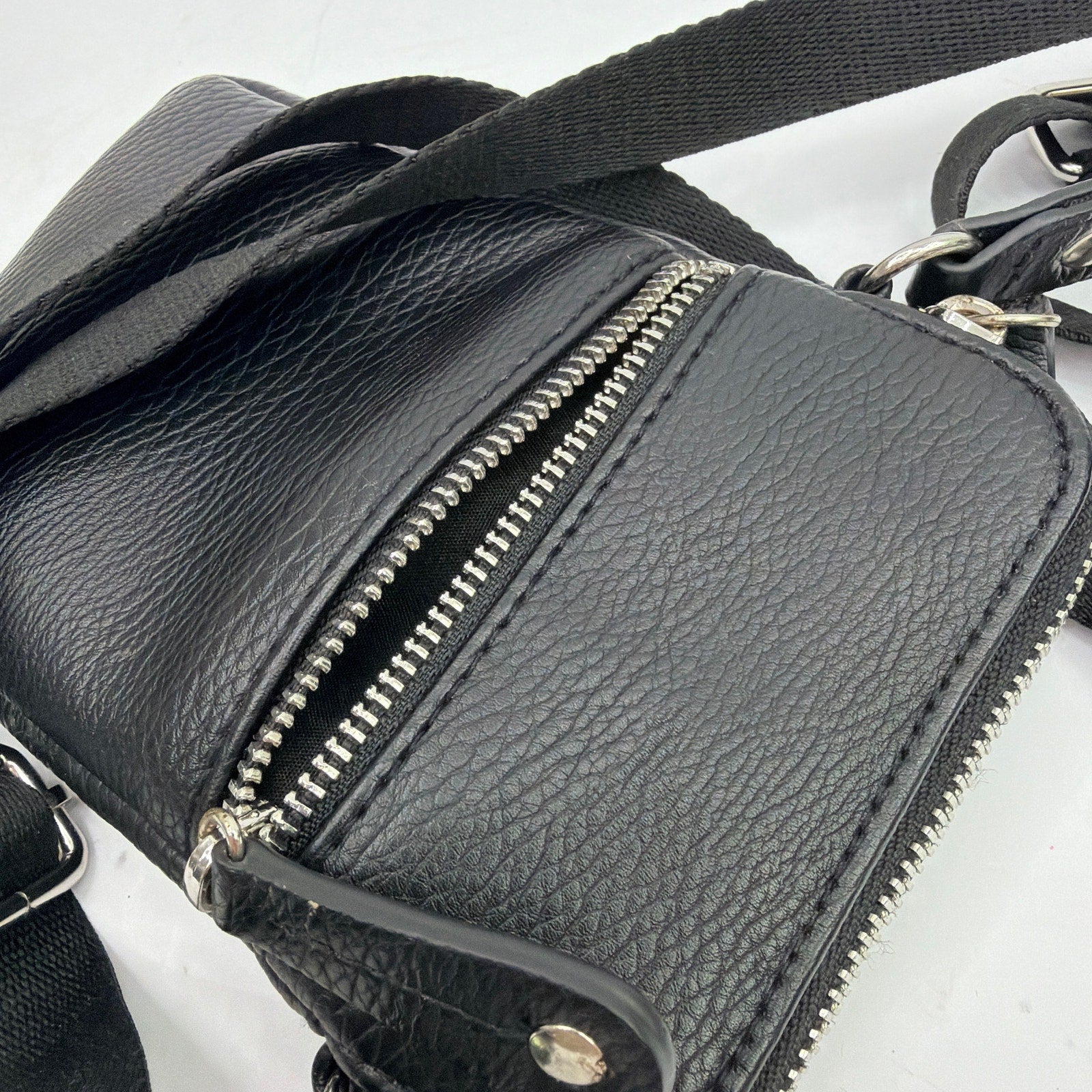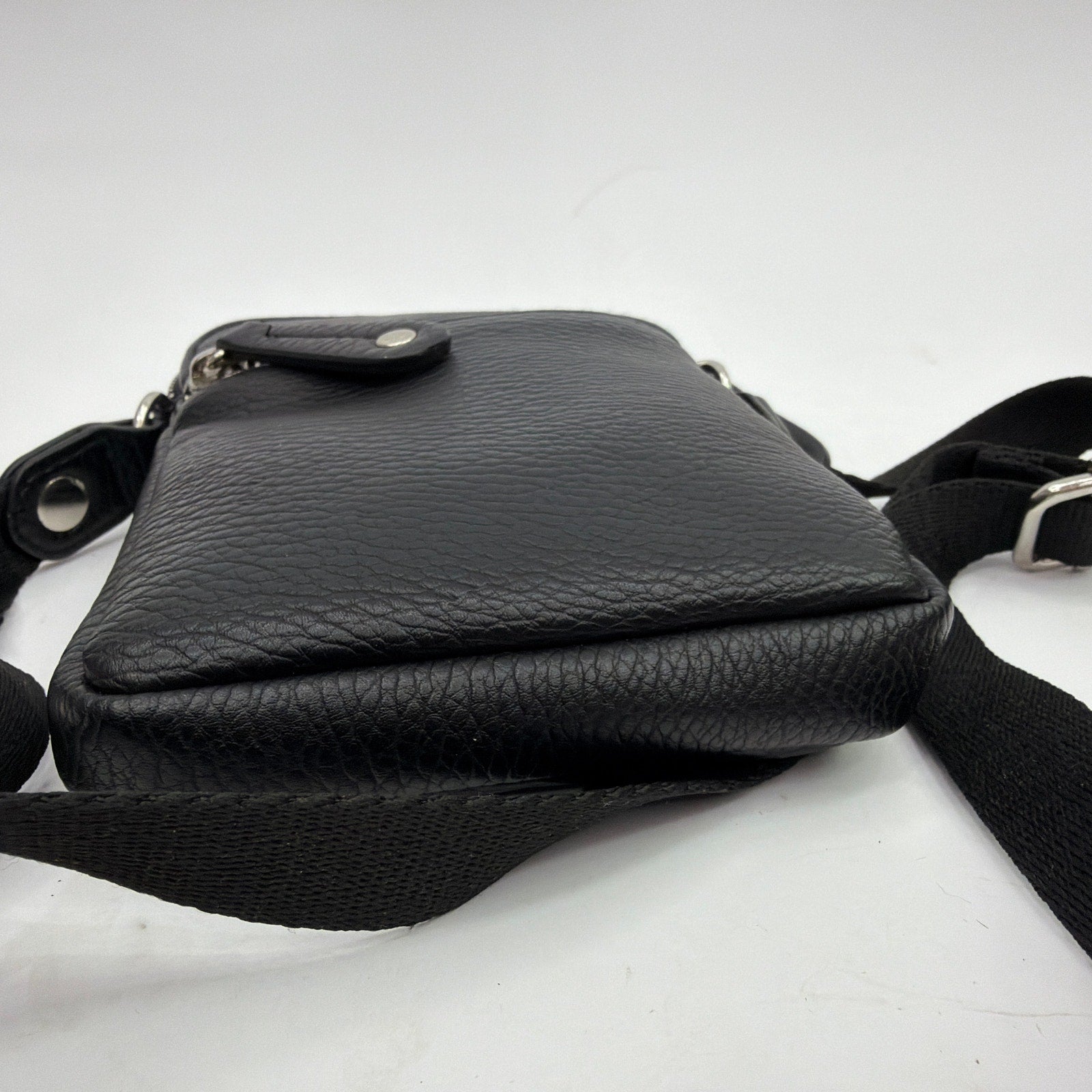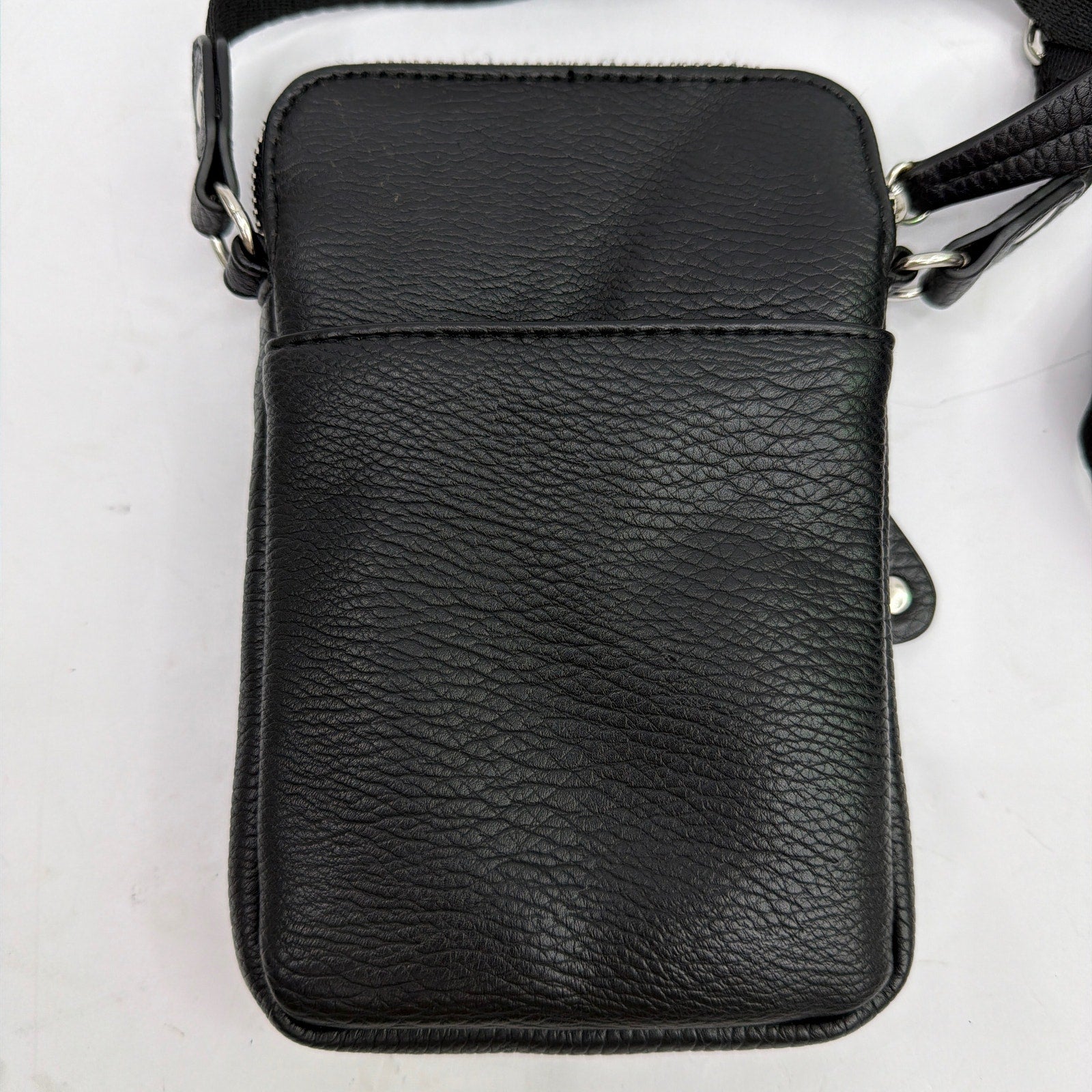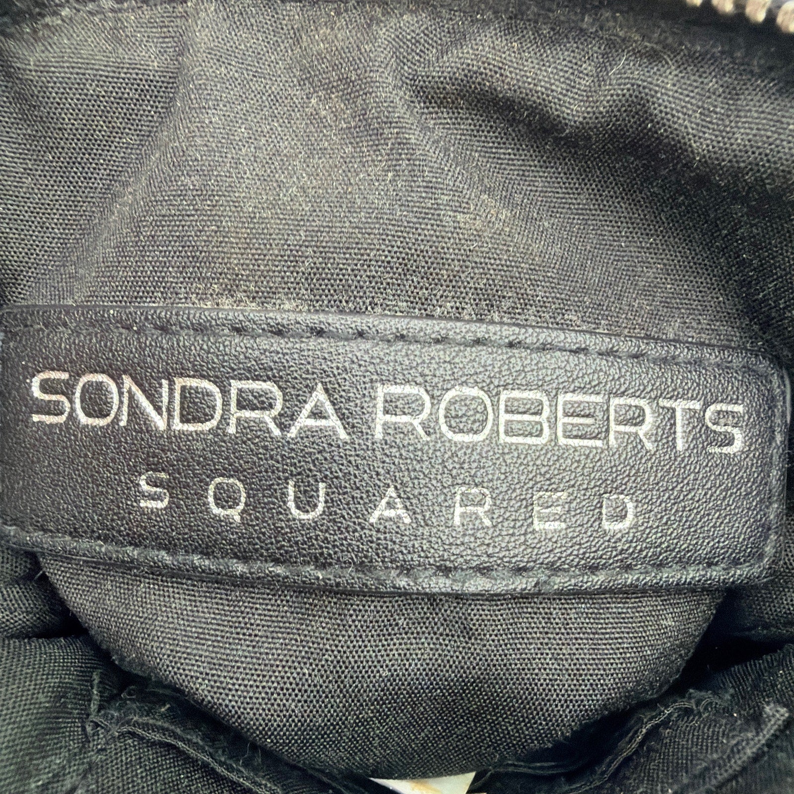 Sondra Roberts “Squared” small black pebbled-leather crossbody bag with an adjustable webbing strap and silver-tone hardware. Approx. 4.5" x 7.5" x 1" with zip compartments and a front zip pocket. Pre-owned with light overall wear; strap shows noticeable rubbing/marks and the interior may have minor signs of use. Made in Cambodia (per tag).
