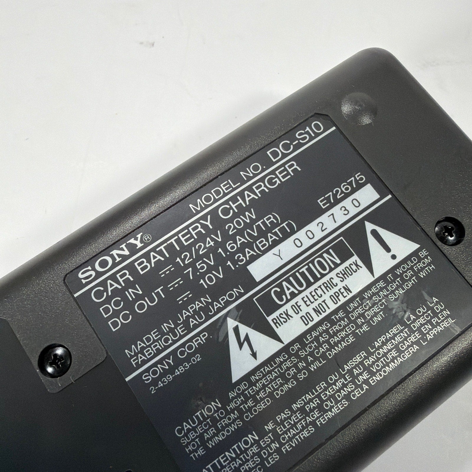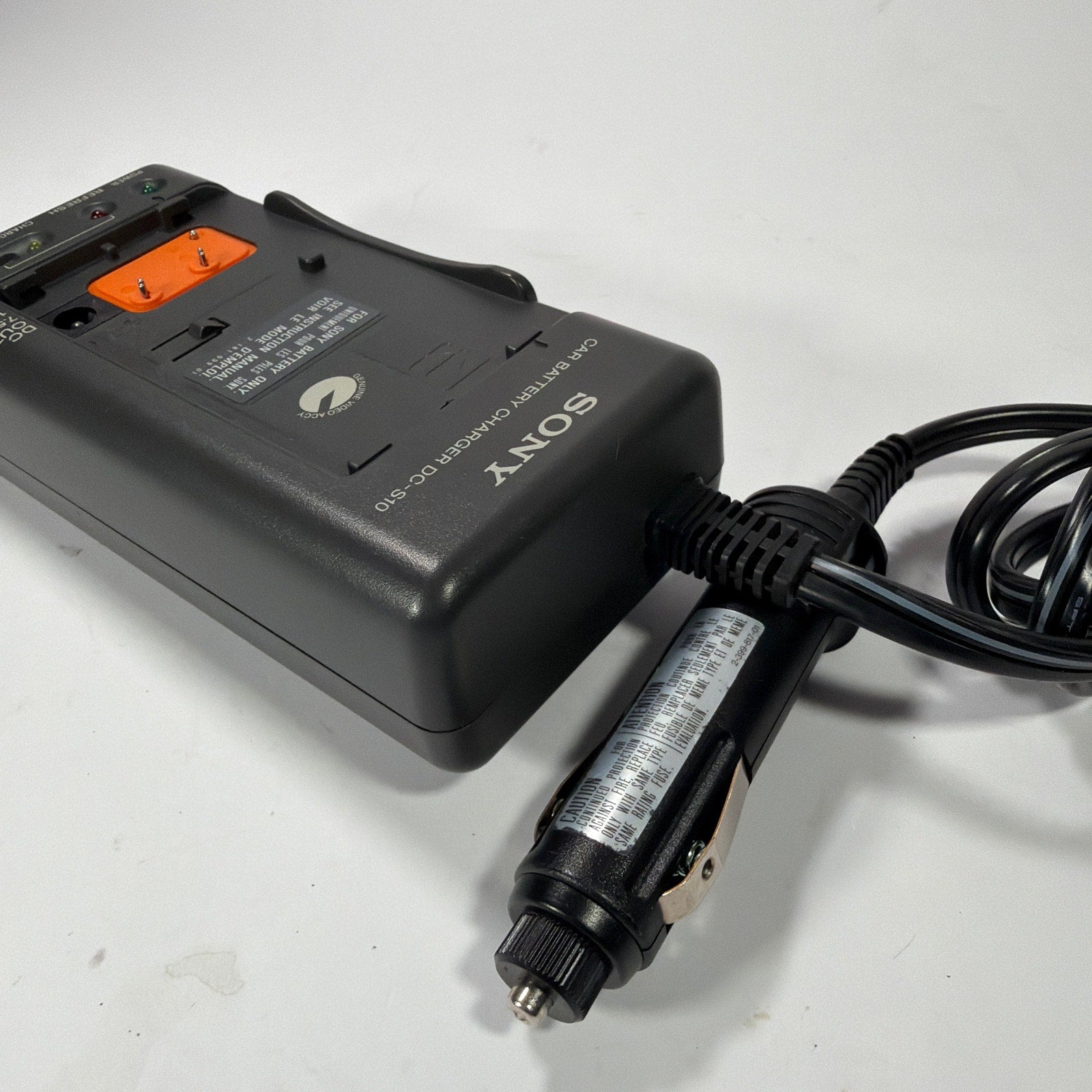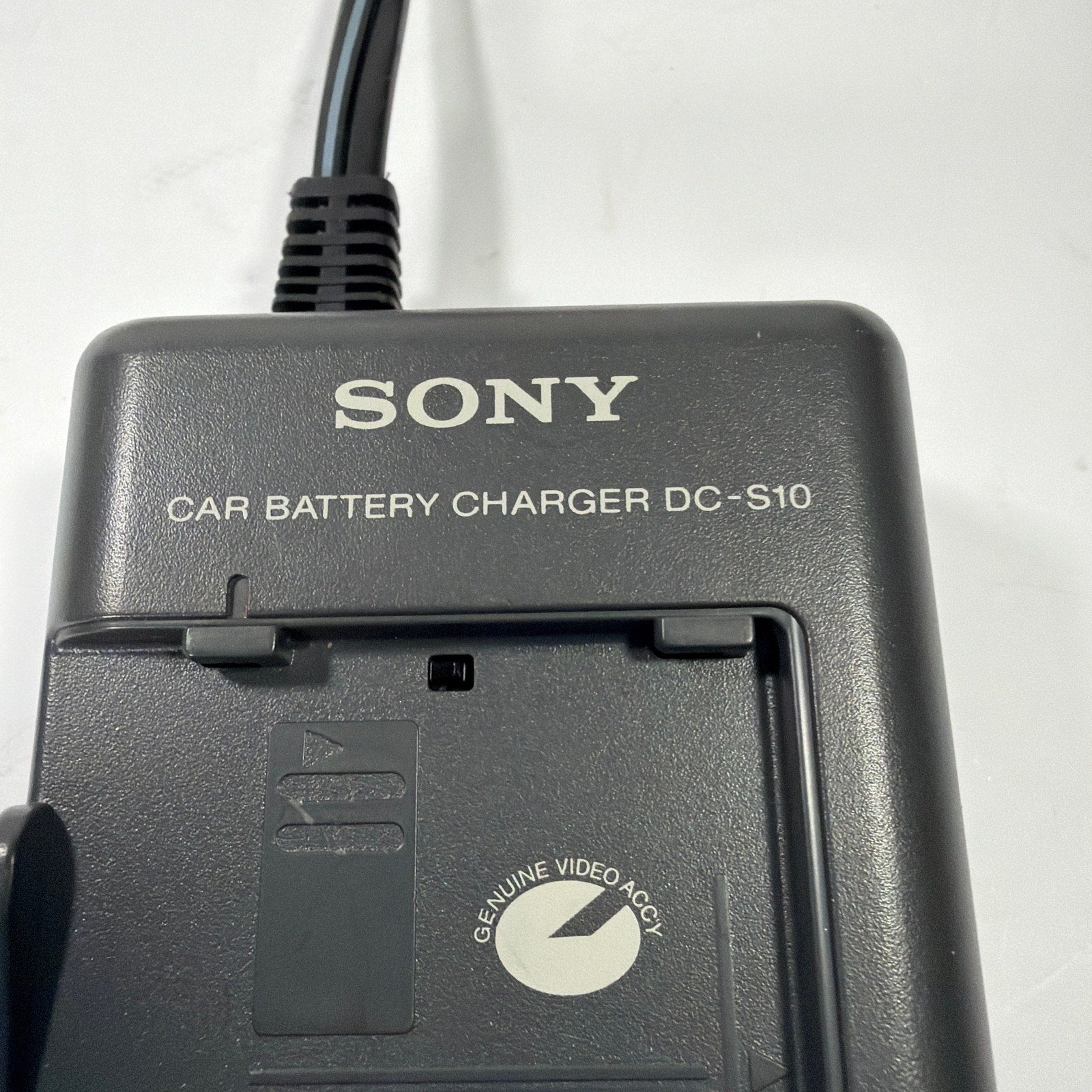 Sony car battery charger, model DC-S10, with attached 12V cigarette-lighter plug cord. Tested and working. Pre-owned with light surface wear/scuffs from normal use. Includes only the charger as shown (no box or manuals).