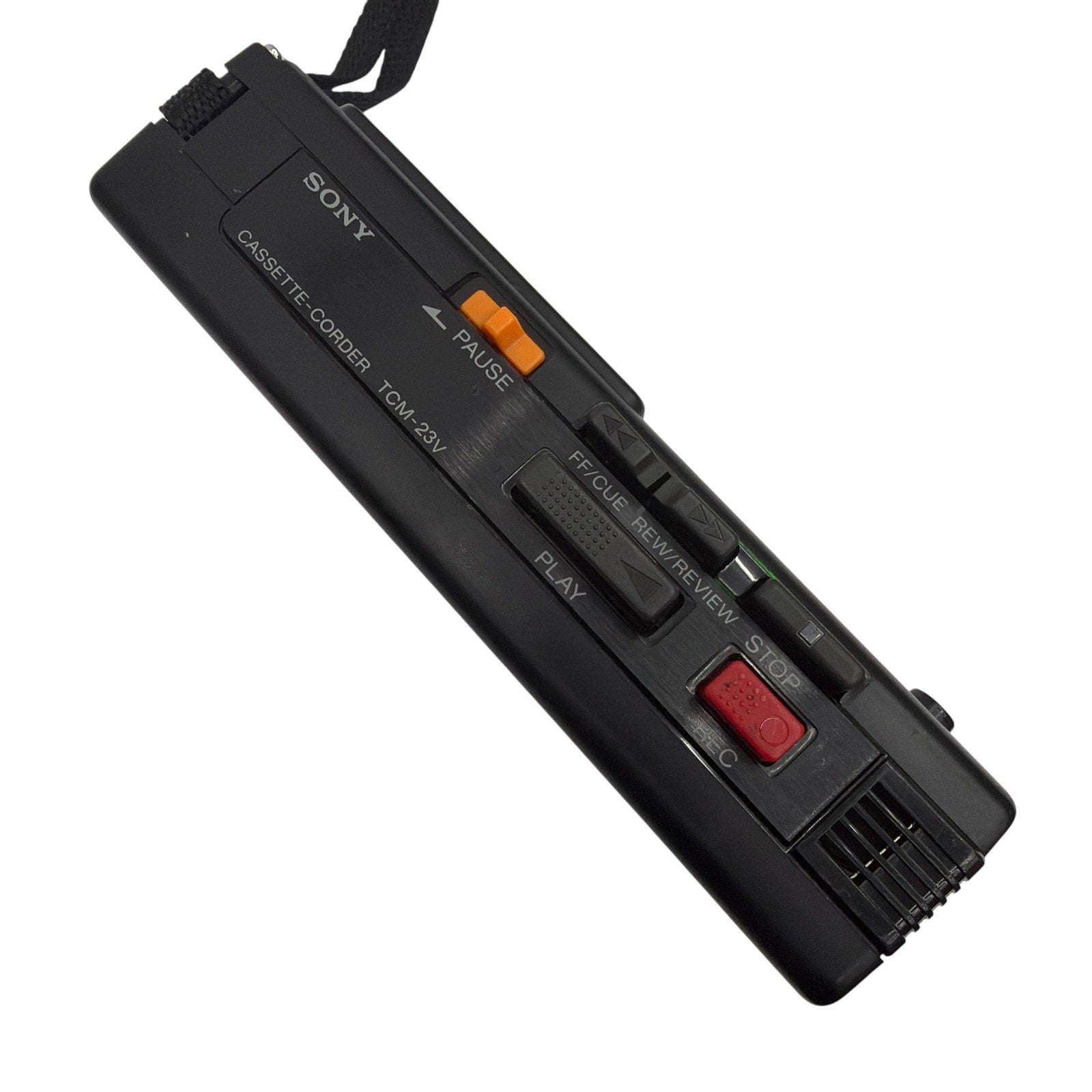 Sony TCM-23V portable cassette recorder/player in pre-owned condition. Records and plays, but the built-in speaker output is very quiet. Cosmetic wear may be present, including scuffs and marks. Includes the recorder with wrist strap only; no other accessories are included. Sold as-is for repair or parts.
