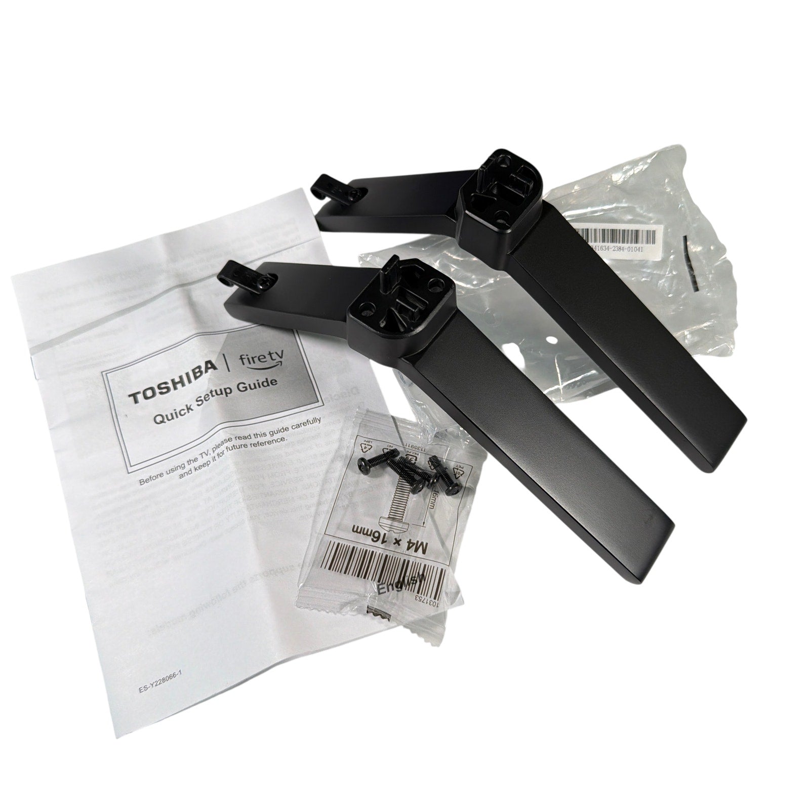 Set of black TV stand legs/base feet for Toshiba Fire TV model 43C350LU (legs marked 2085 L and 2085 R). Includes the M4 x 16mm screws shown and the Toshiba Fire TV quick setup guide. Included screws are for the 43" TV; different screws are needed for 55" models. Parts appear in clean condition and may have minor handling marks.