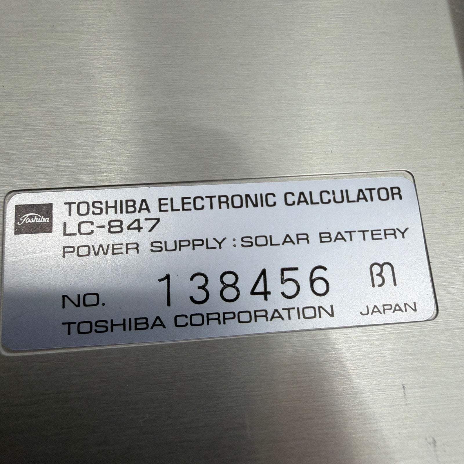 Toshiba electronic calculator model LC-847 with original brown folio-style cover. Tested and working. Shows cosmetic wear from age and use, including scuffs/scratches and some discoloration/yellowing that may be visible in person. Made in Japan. Includes calculator and case only.