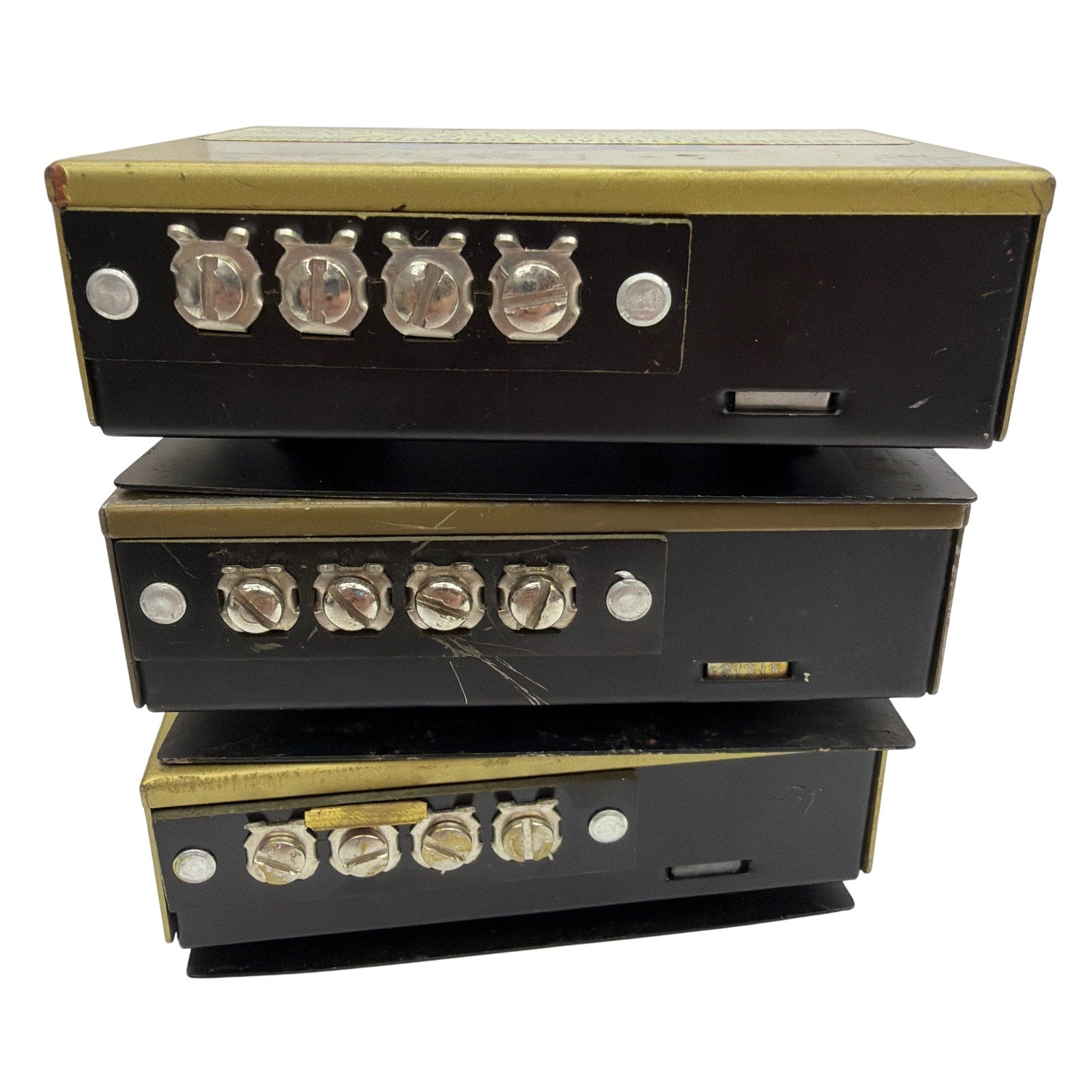 Lot of three vintage Tyco HO scale hobby transformer power packs, including a mix of Model 899V and 899T units as shown. All three have been tested for voltage output, though they have noticeable cosmetic wear such as scratches, scuffs, and finish loss. One transformer has a broken speed control handle; the remaining handles are intact. Includes the transformers, wiring leads, and terminal block pieces shown in the photos; no additional accessories or original packaging are included.