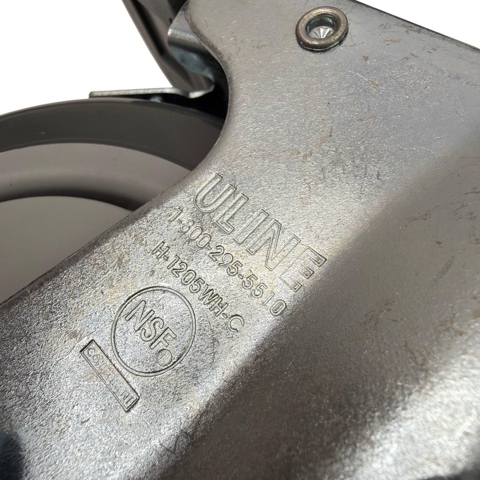 Set of four lightly used Uline H-1205WH-C 5" polyurethane swivel stem casters for chrome wire shelving units. Each caster is lockable and rated for up to 250 lb, for a total capacity of 1,000 lb per set when used as intended. Casters show minor cosmetic wear from light prior use but no significant damage and are guaranteed to be fully functional. Set includes four casters only, with no shelving posts or additional hardware included beyond what is shown in the photos.