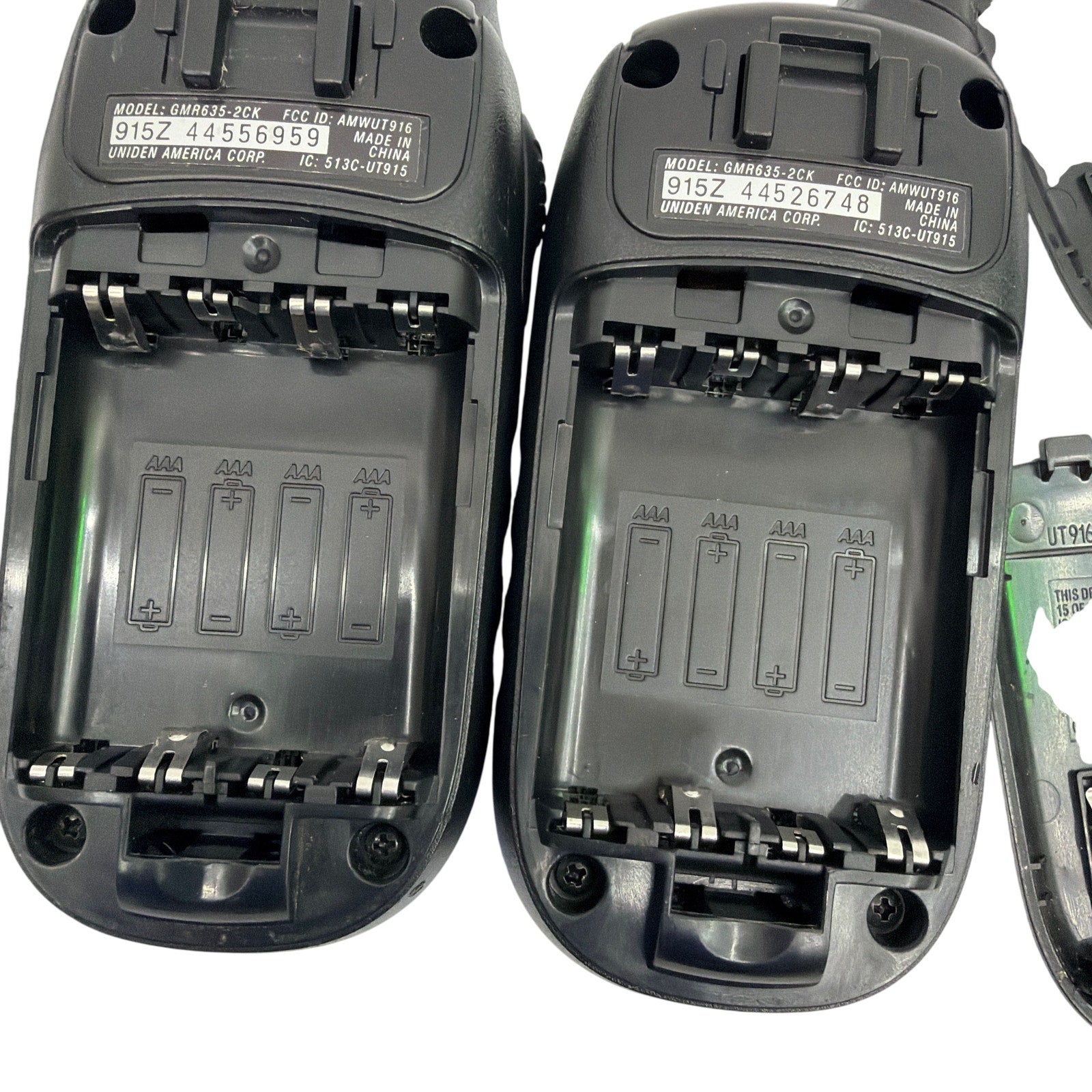 Set of 2 Uniden GMR635-2CK handheld two-way radios in black. Both units were tested and are working. Cosmetic wear from use is present, and one antenna is damaged with the internal spring exposed. Includes the two radios and two belt clips only; batteries and charger are not included.
