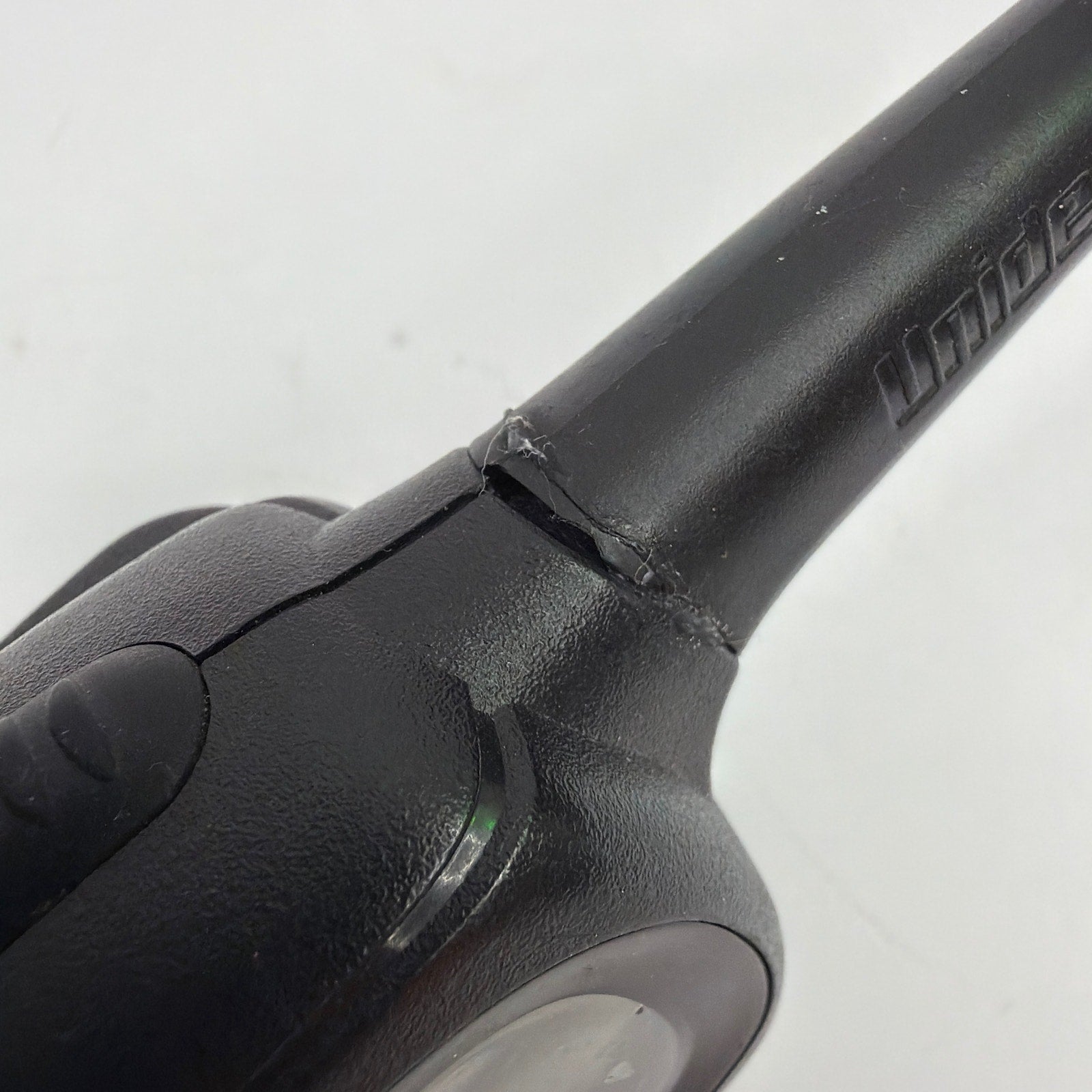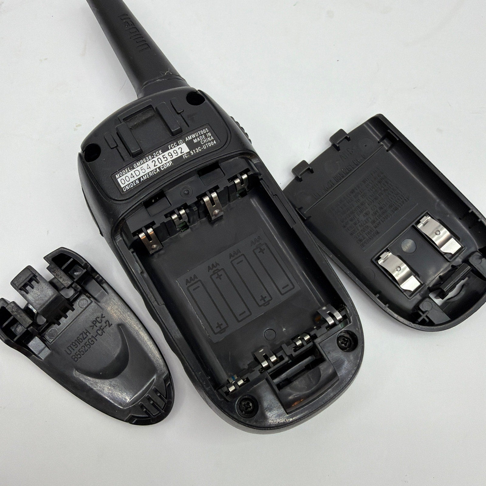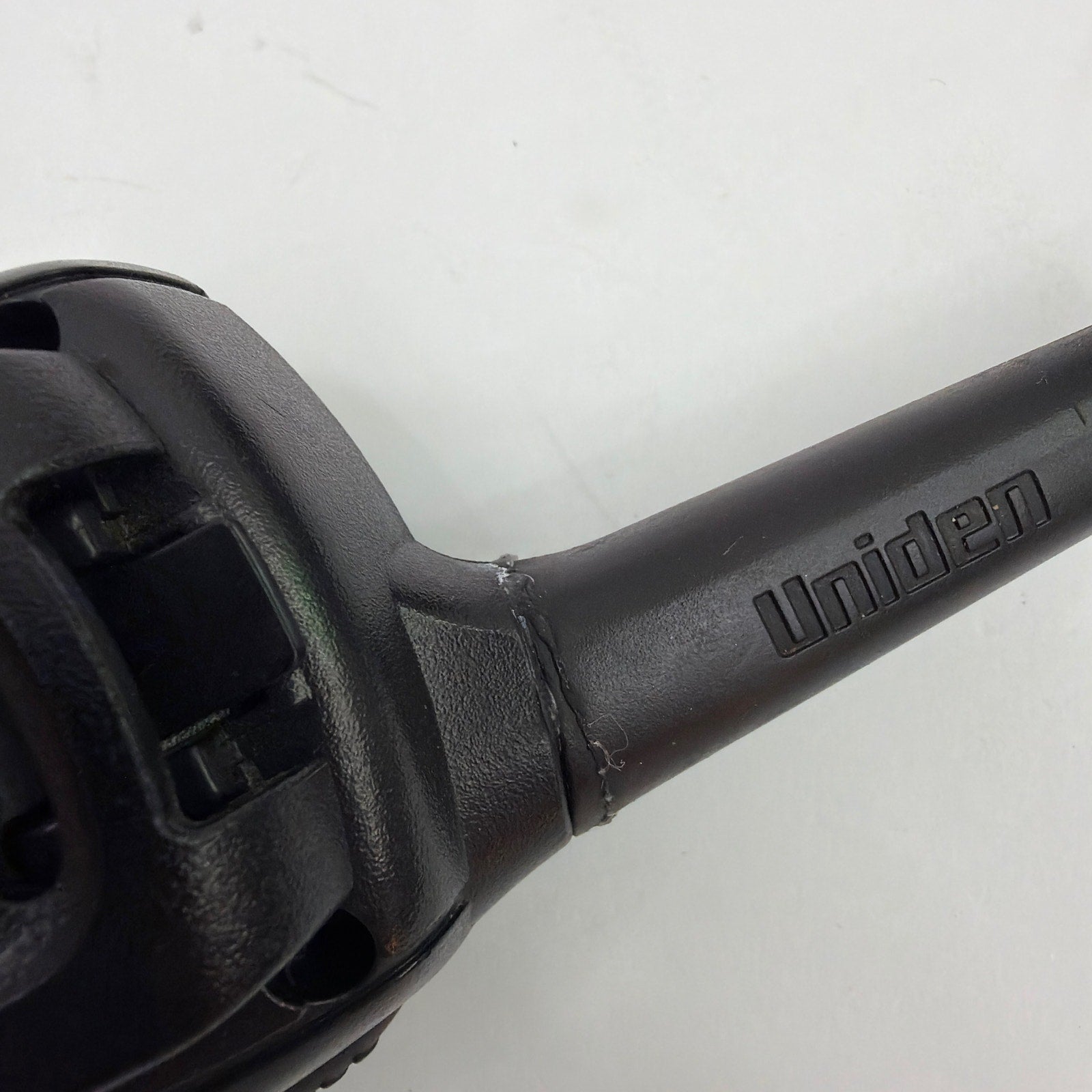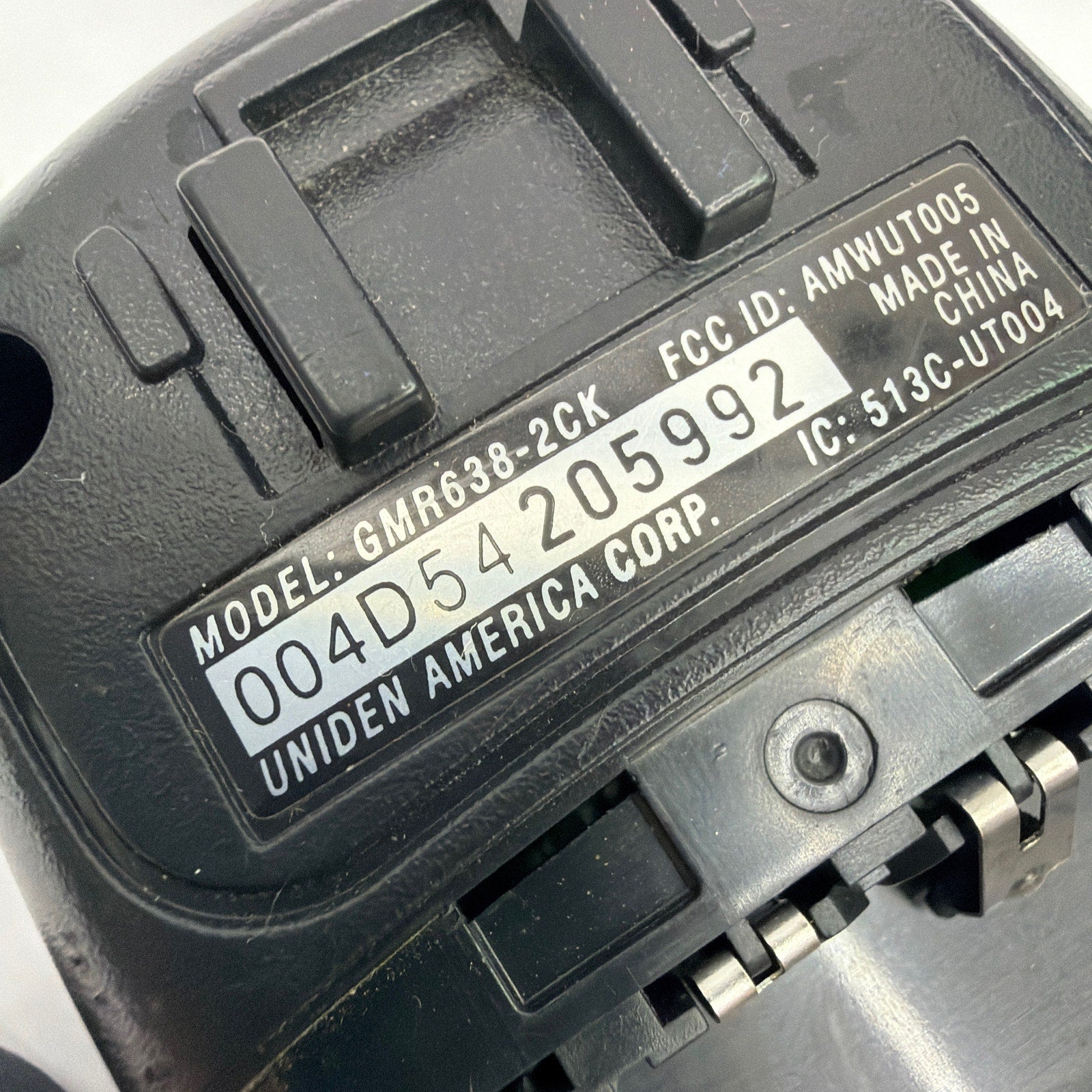 Uniden handheld two-way radio, model GMR638-2CK. Tested working. Antenna cover has been glued back on and shows visible repair; radio also has typical cosmetic wear from use (scuffs/scratches). Includes the radio only; no other accessories are included.