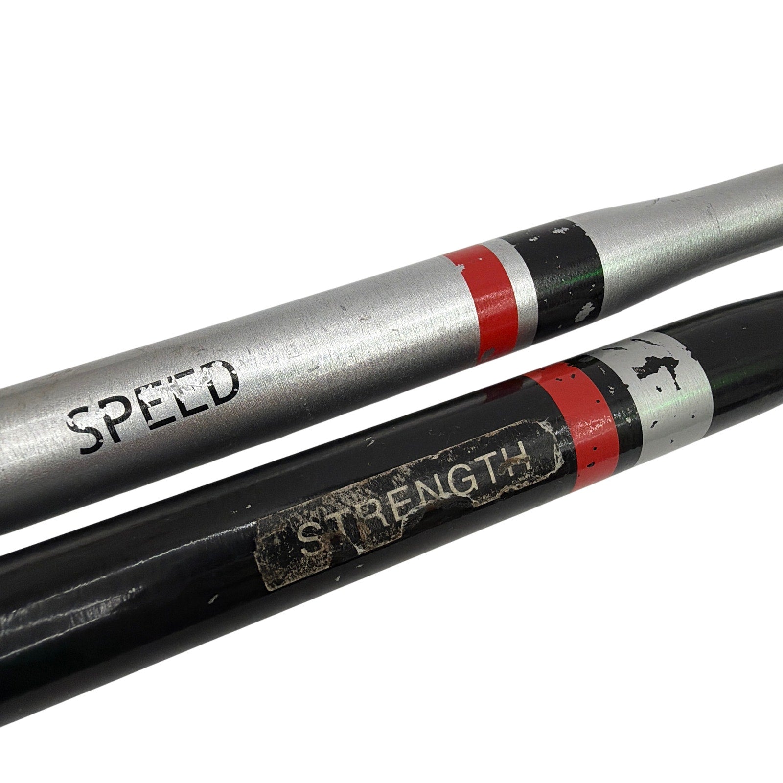 Pair of Velocity Bat alloy baseball training bats, one labeled SPEED in 33" length (silver) and one labeled STRENGTH in 34" length (black). Both show noticeable cosmetic wear including paint loss, barrel scuffs, and surface marks from regular use. The grip tape on the black 34" bat is heavily worn and torn and will likely need to be rewrapped; the silver 33" grip shows moderate wear. Despite the cosmetic condition, both bats are guaranteed to be fully functional. Sold together as a two-bat lot as shown in photos.
