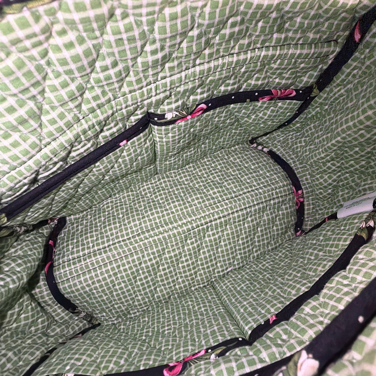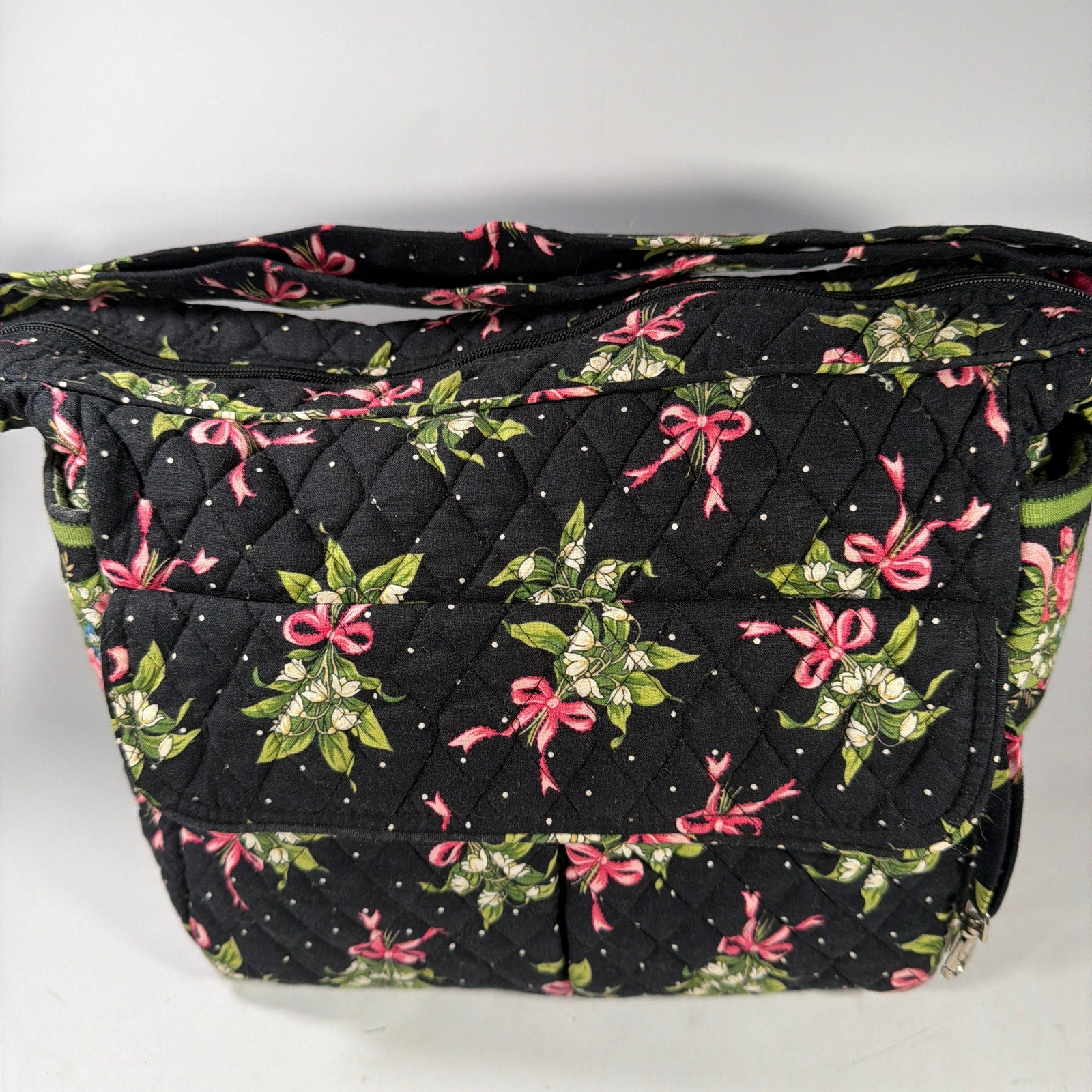 Vera Bradley quilted fabric shoulder bag in a black print with pink bows and floral accents. Approximate size is 12 x 6 x 10 in. Pre-owned condition with visible lint/fuzzing and light surface wear; minor marks or discoloration may be present.