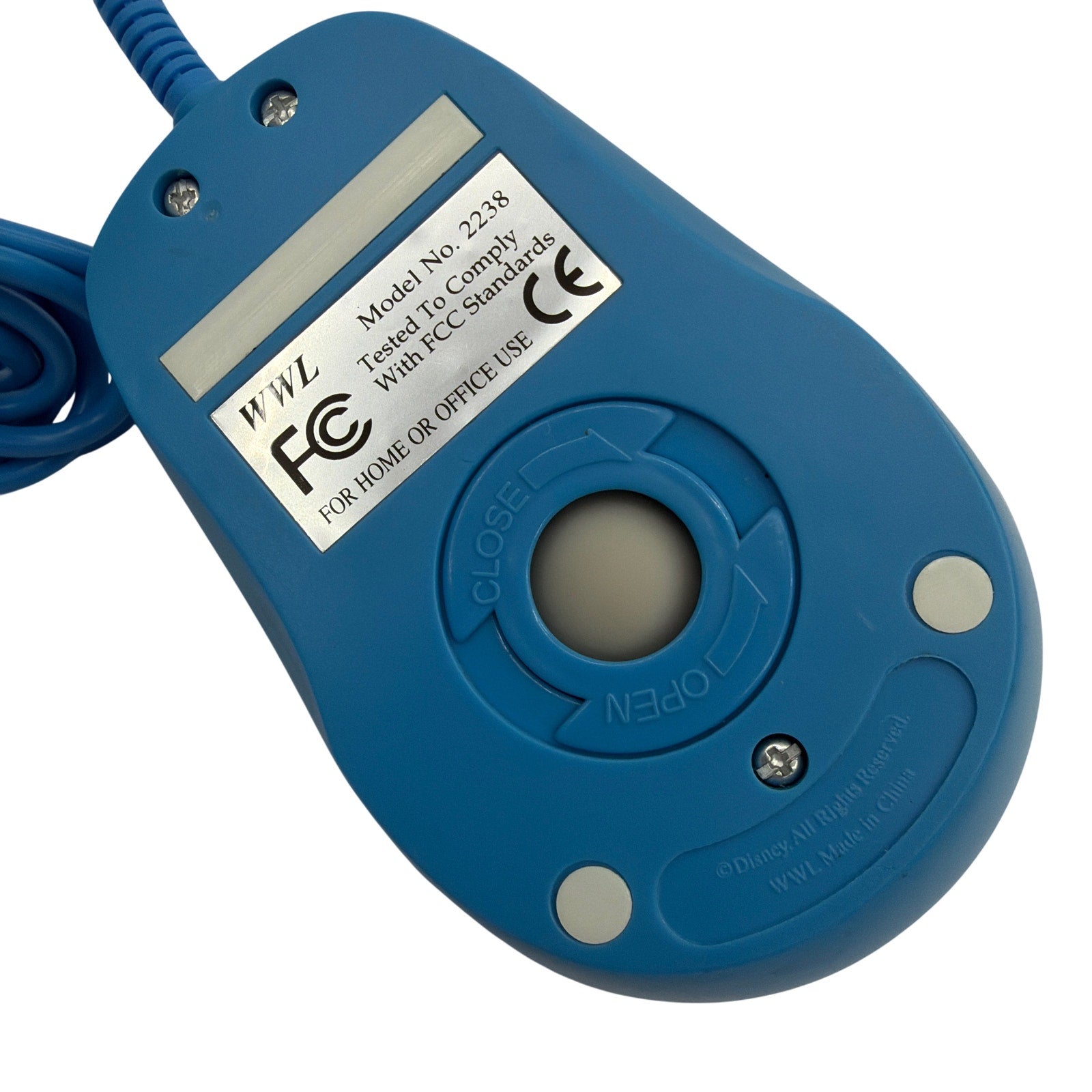 Pre-owned Disney Mickey Mouse wired computer mouse, WWL model 2238, with blue housing and raised multicolor Mickey graphic on the top. Mouse has been tested and is fully functional as a mechanical ball-style PS/2 mouse. Cosmetically it shows light wear consistent with use, including some small marks and a visible scuff on Mickey’s yellow shoe area. Mouse only is included; no box, adapters, or other accessories are included.