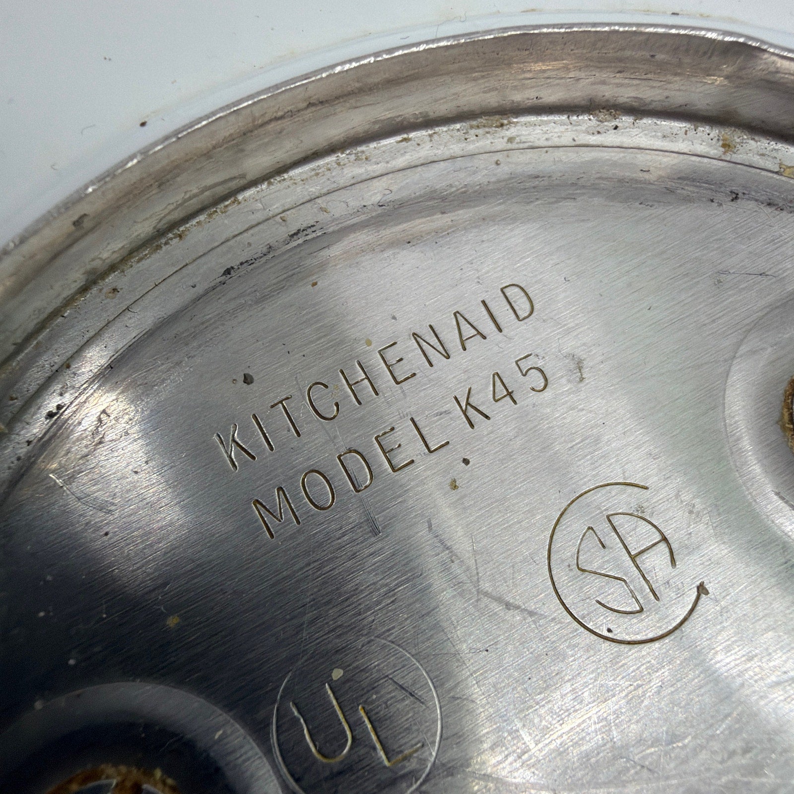 Vintage KitchenAid/Hobart tilt-head stand mixer, Model K45 (Made in USA). Powers on and runs but grinds and is expected to need a complete rebuild/service. Power cord insulation appears brittle/cracked with wear, so it should be replaced before regular use. Cosmetic wear includes scuffs, marks, and discoloration. Includes stainless steel bowl and attachments shown (wire whip, flat beater, dough hook).